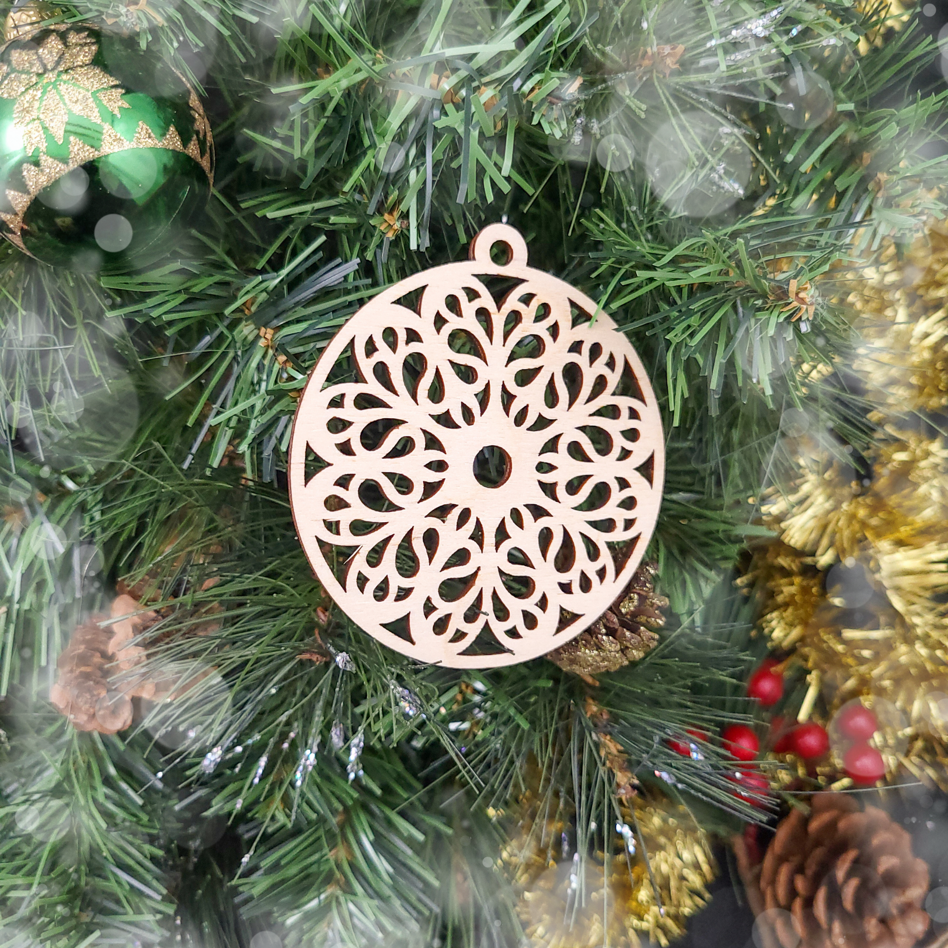 One of our popular spindle designs, transformed into a holiday ornament! This ornament is cut from 1/8" Baltic birch ply for extra sturdiness. It comes in two different sizes, just like our top whorl spindles: 3" in diameter or, for smaller scale decorations, 2.25" in diameter.