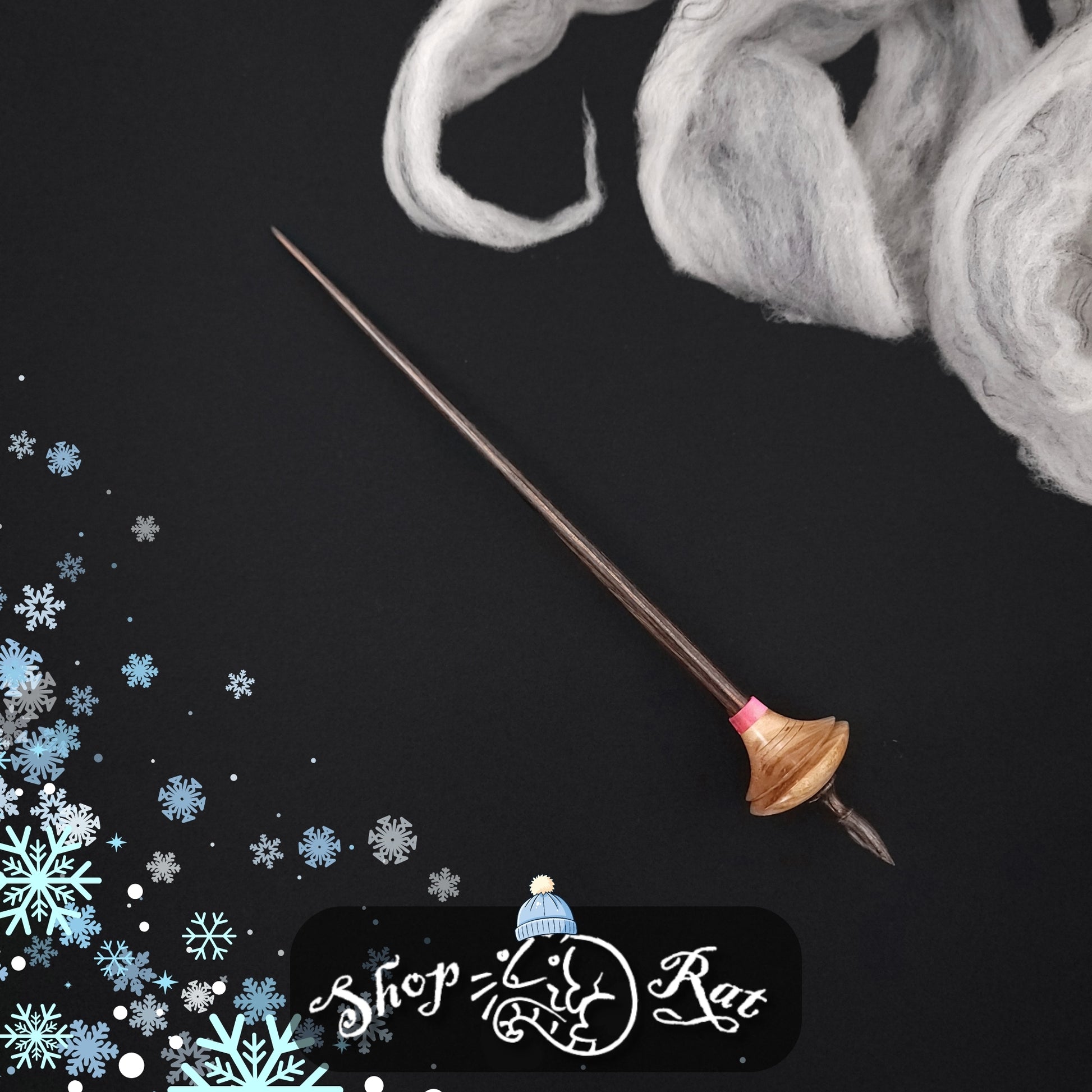 Mid size bead spindle turned by the Shop Rat in stabilized quilted maple and set on a walnut-colored Dymalux shaft turned by Mike. This spindle measures 10" inches long and weighs 18 grams.