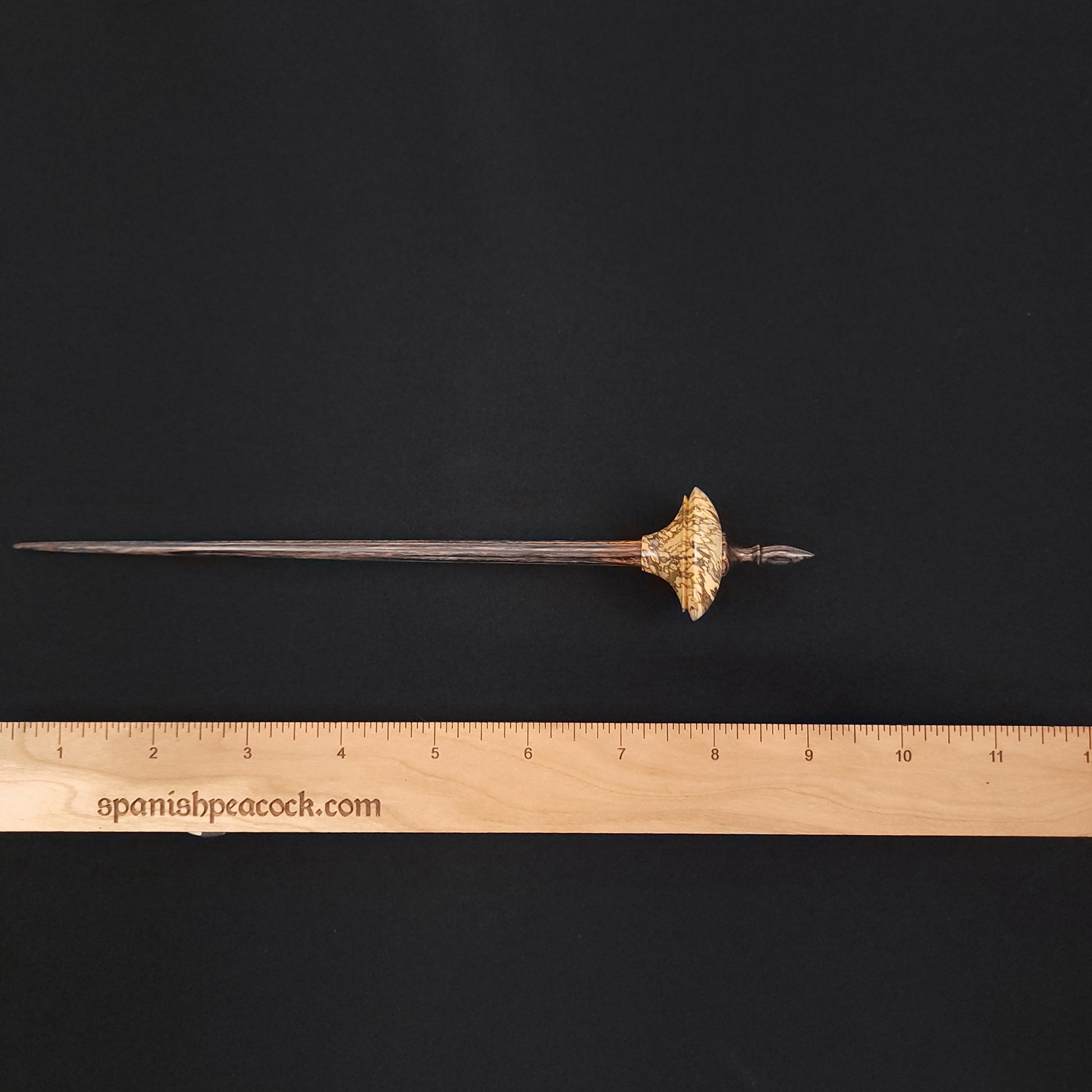Pocket bead spindle turned by the Shop Rat in stabilized spalted tamarind and set on a walnut-colored Dymalux shaft turned by Mike. This spindle measures 9" inches long and weighs 17 grams.