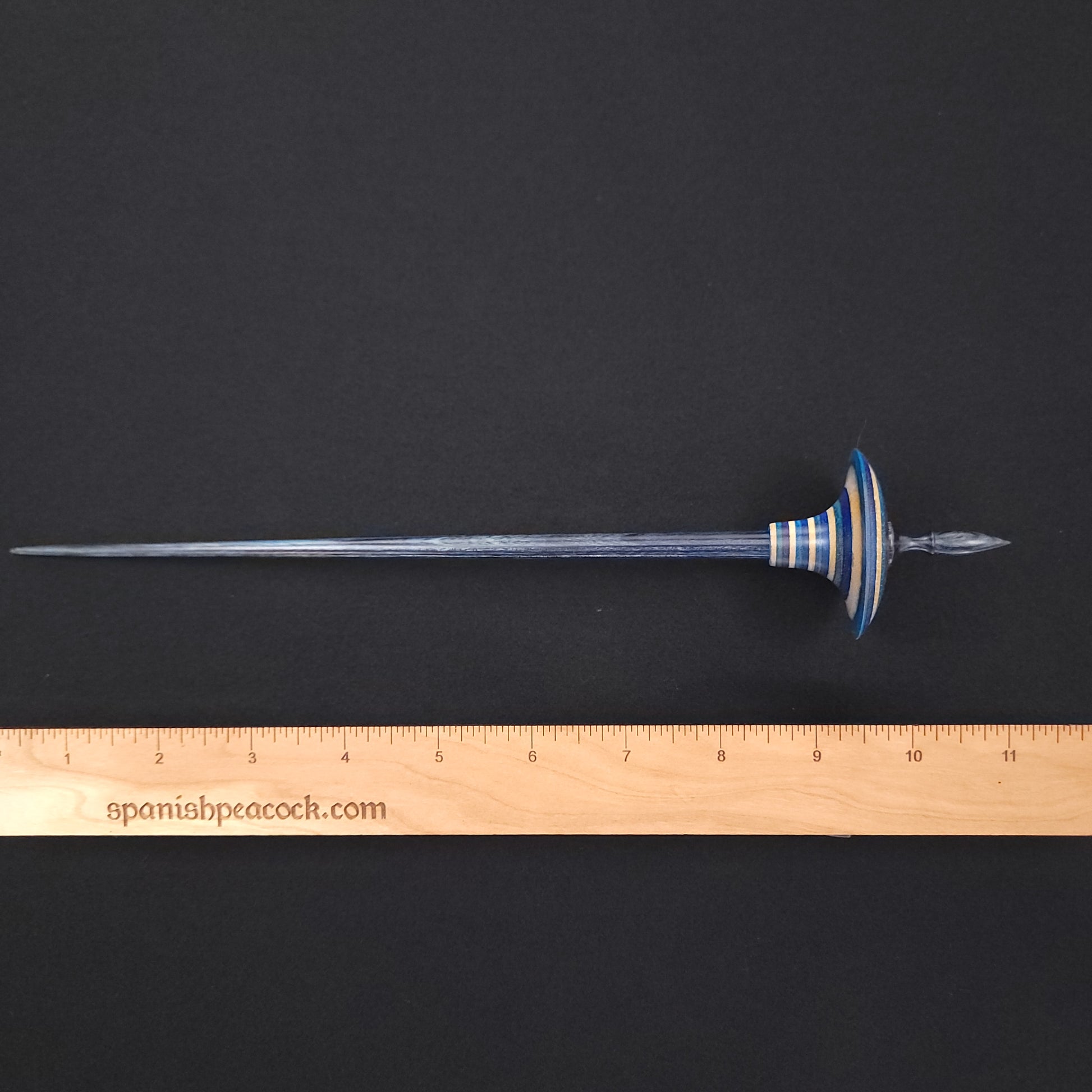 Full size bead spindle turned in "Caribbean Wave" Spectraply birch and set on a blue Dymalux shaft. This spindle measures 11" inches long and weighs 21 grams.