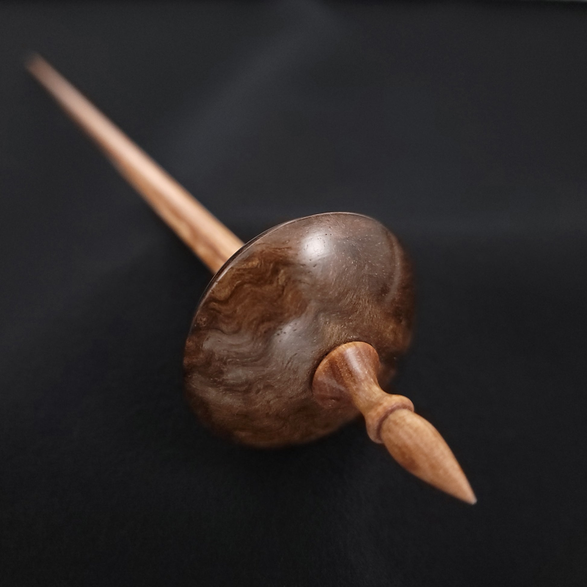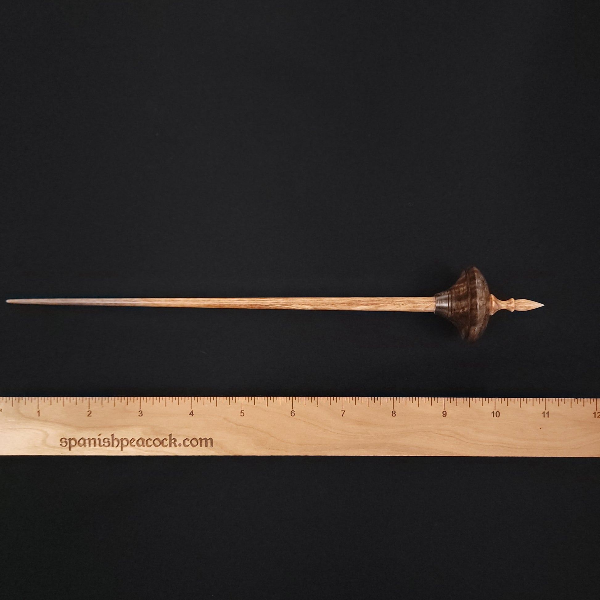 Full size bead spindle turned by the Shop Rat in stabilized curly black mango and set on a natural-colored Dymalux shaft turned by Mike. This spindle measures 11" inches long and weighs 22 grams.