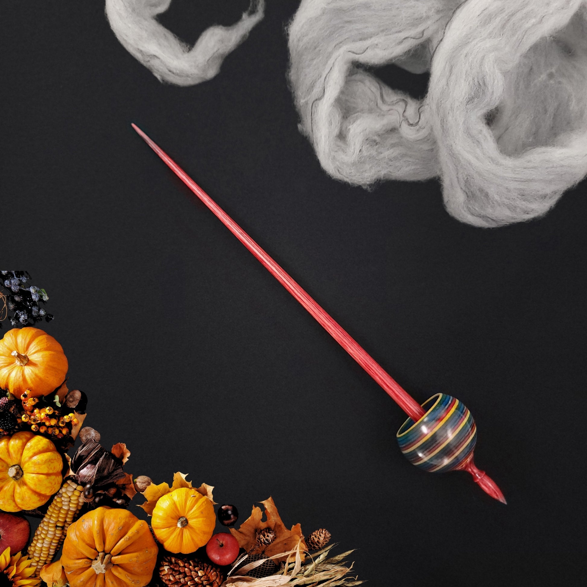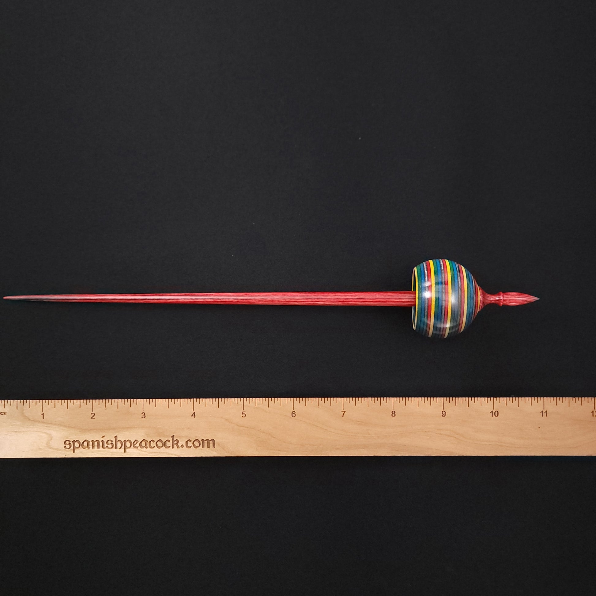 Full size ninja spindle turned in "Confetti" Spectraply birch and set on a cherry red Dymalux shaft. This spindle measures 11" inches long and weighs 18 grams.