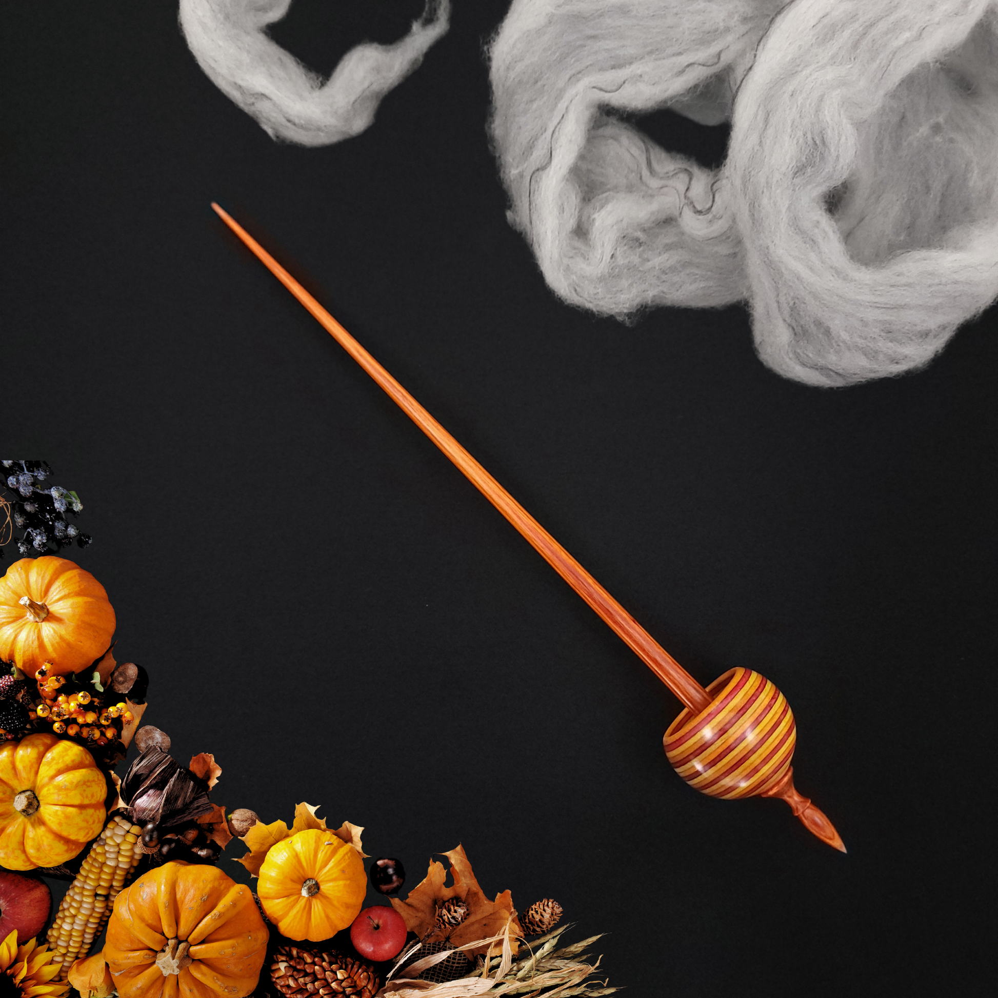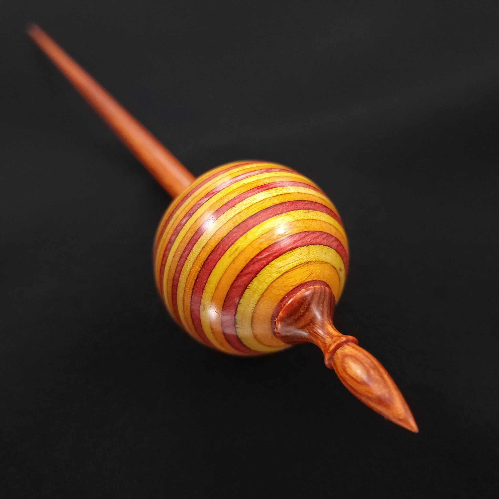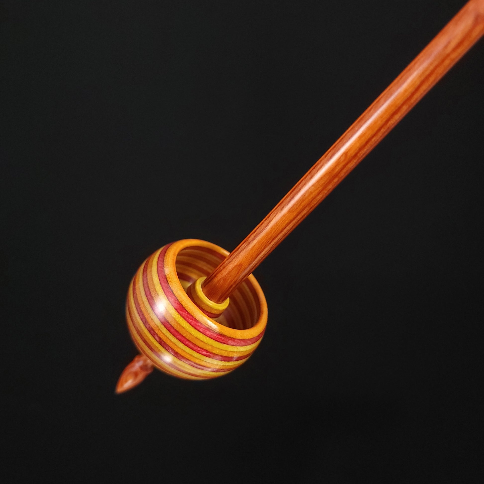 Full size ninja spindle turned in "Tequila Sunrise" Spectraply birch and set on an orange Dymalux shaft. This spindle measures 11" inches long and weighs 18 grams.