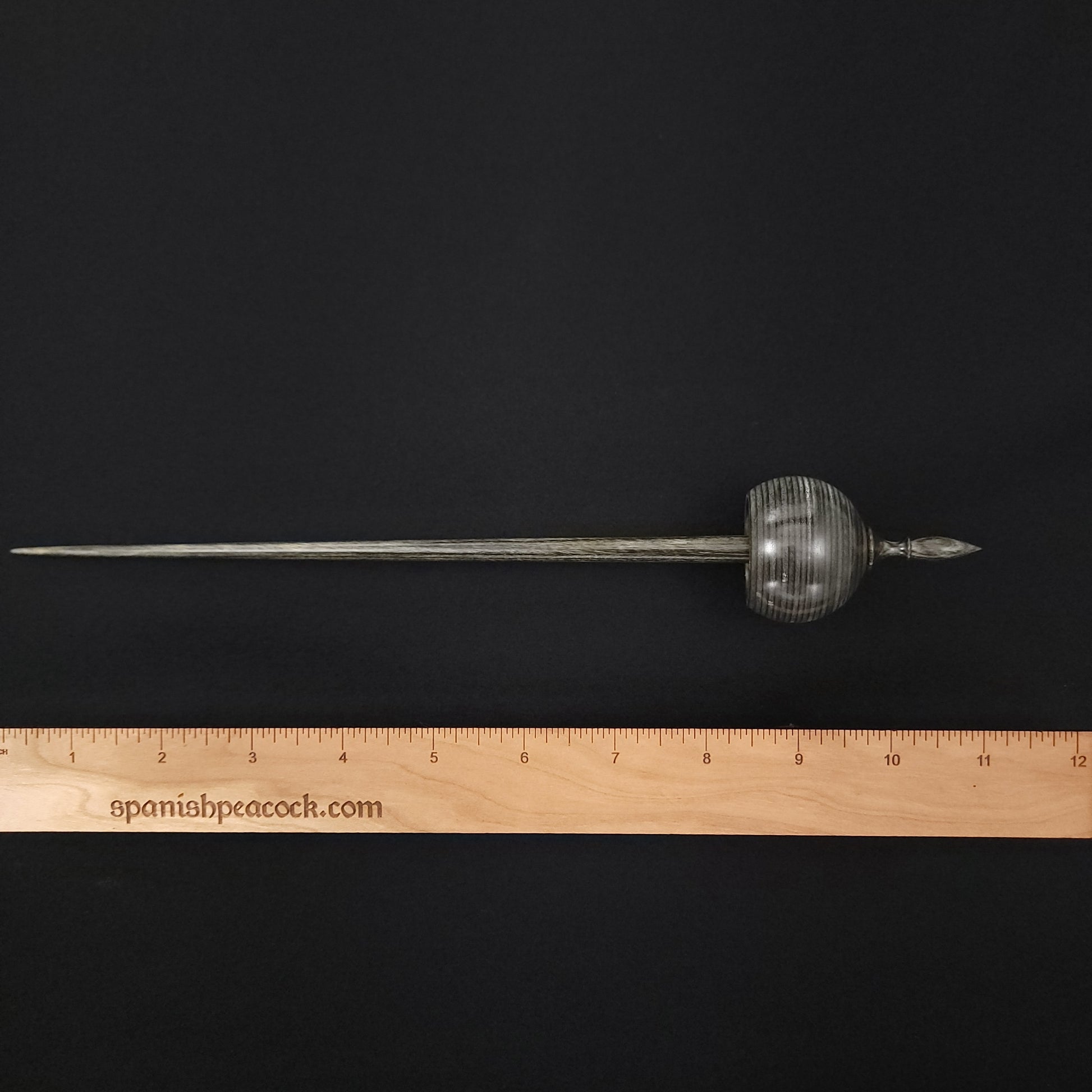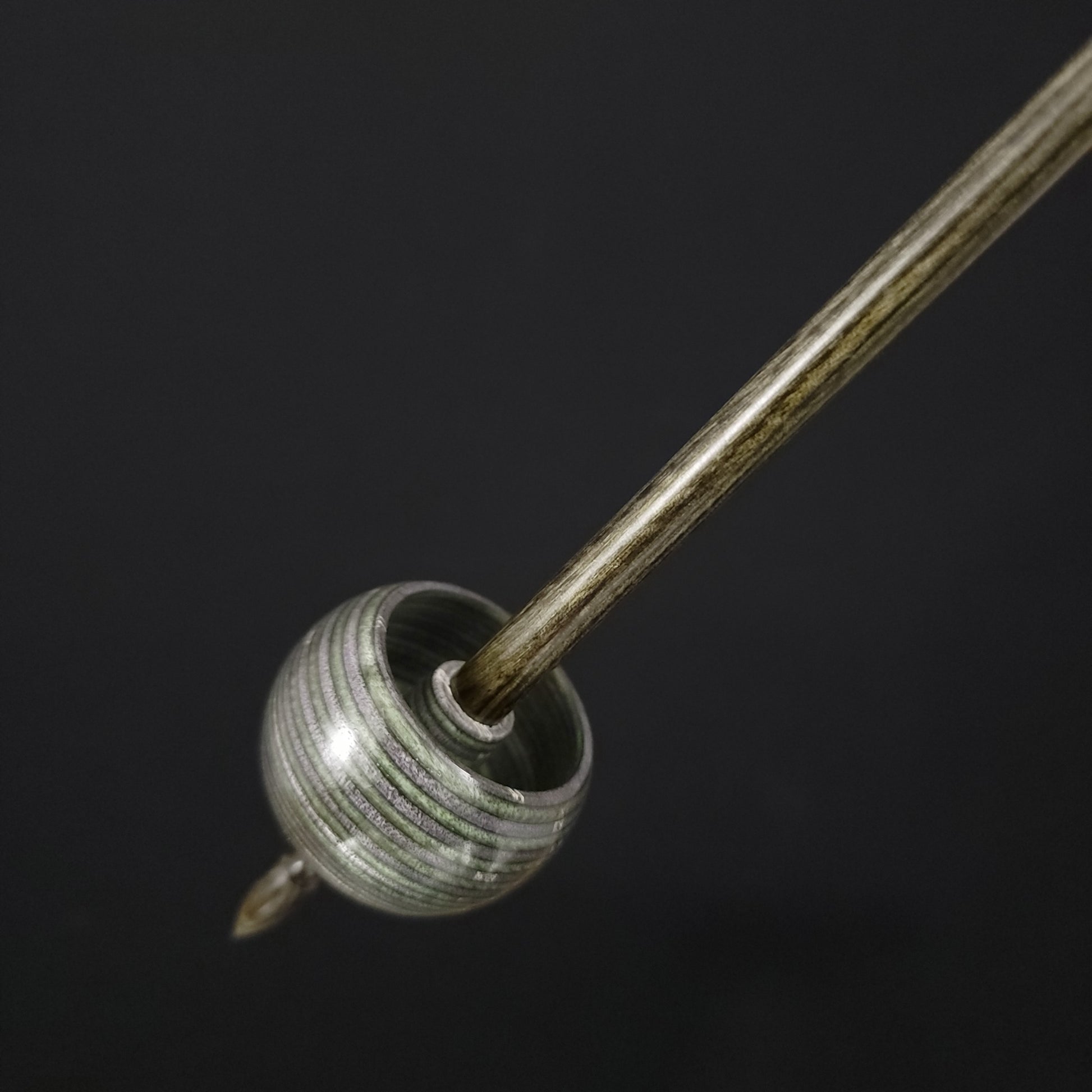 Full size ninja spindle turned in "Olive Shade" Spectraply birch and set on an olive-colored Dymalux shaft. This spindle measures 11" inches long and weighs 20 grams.