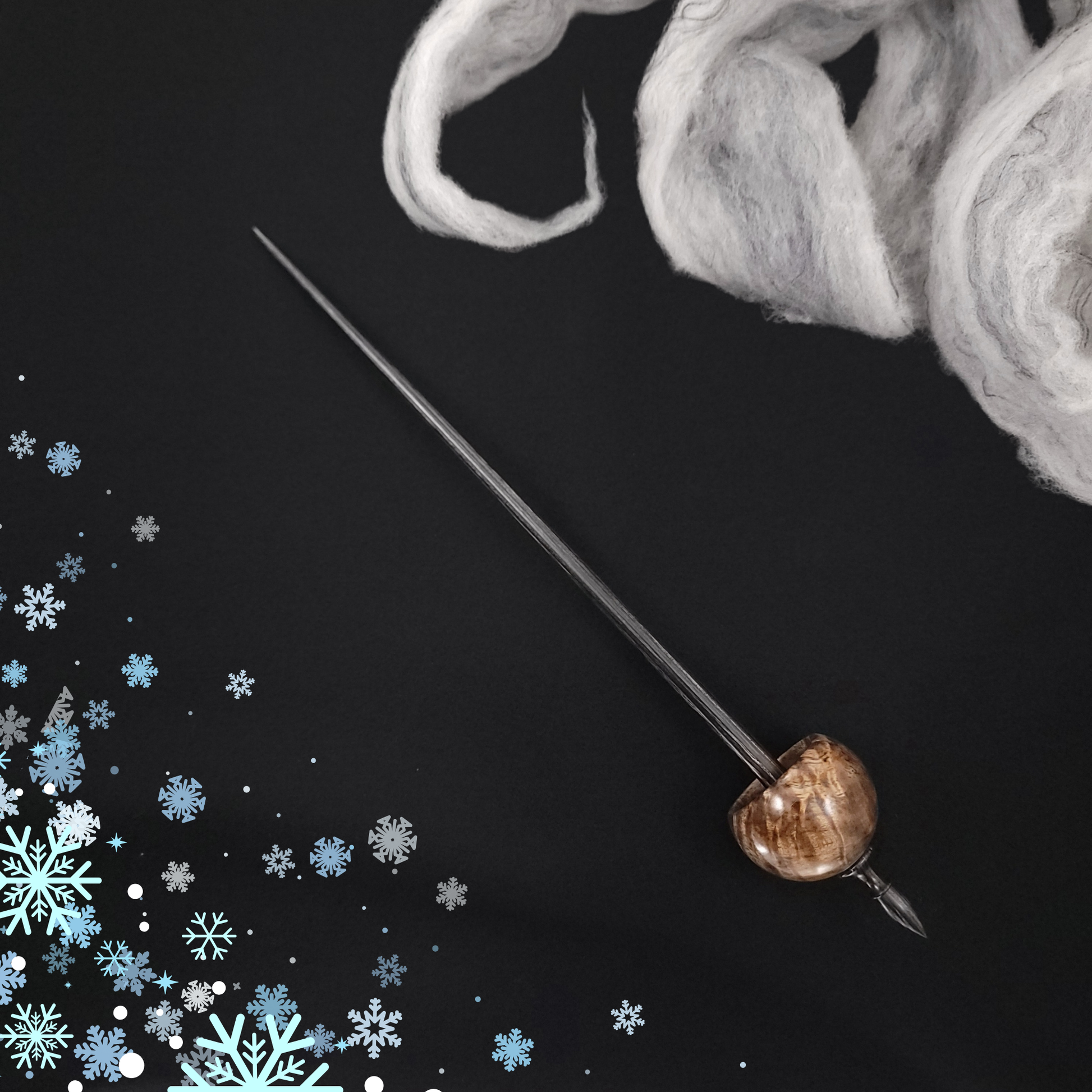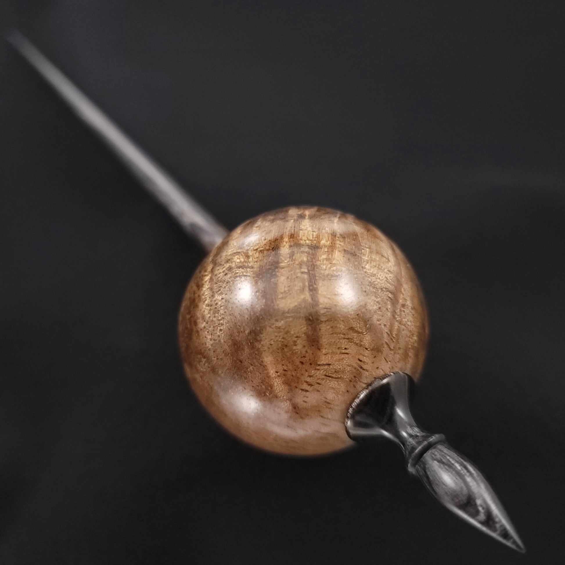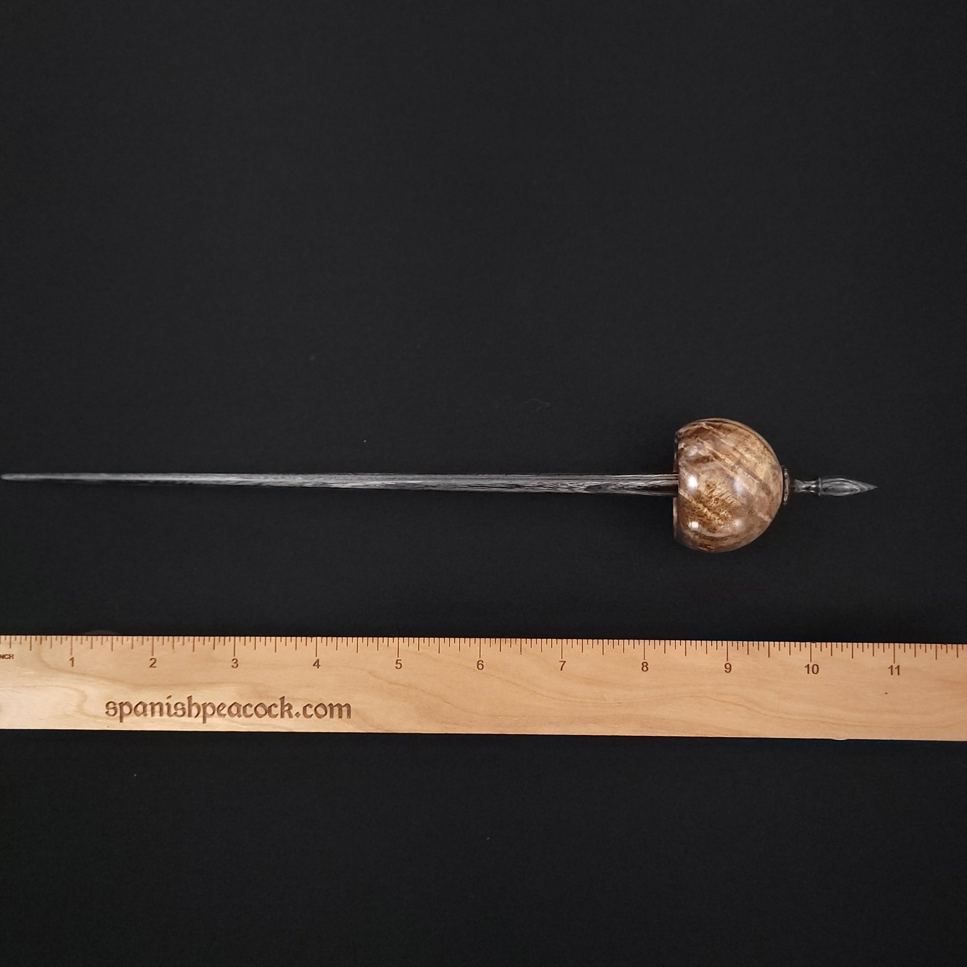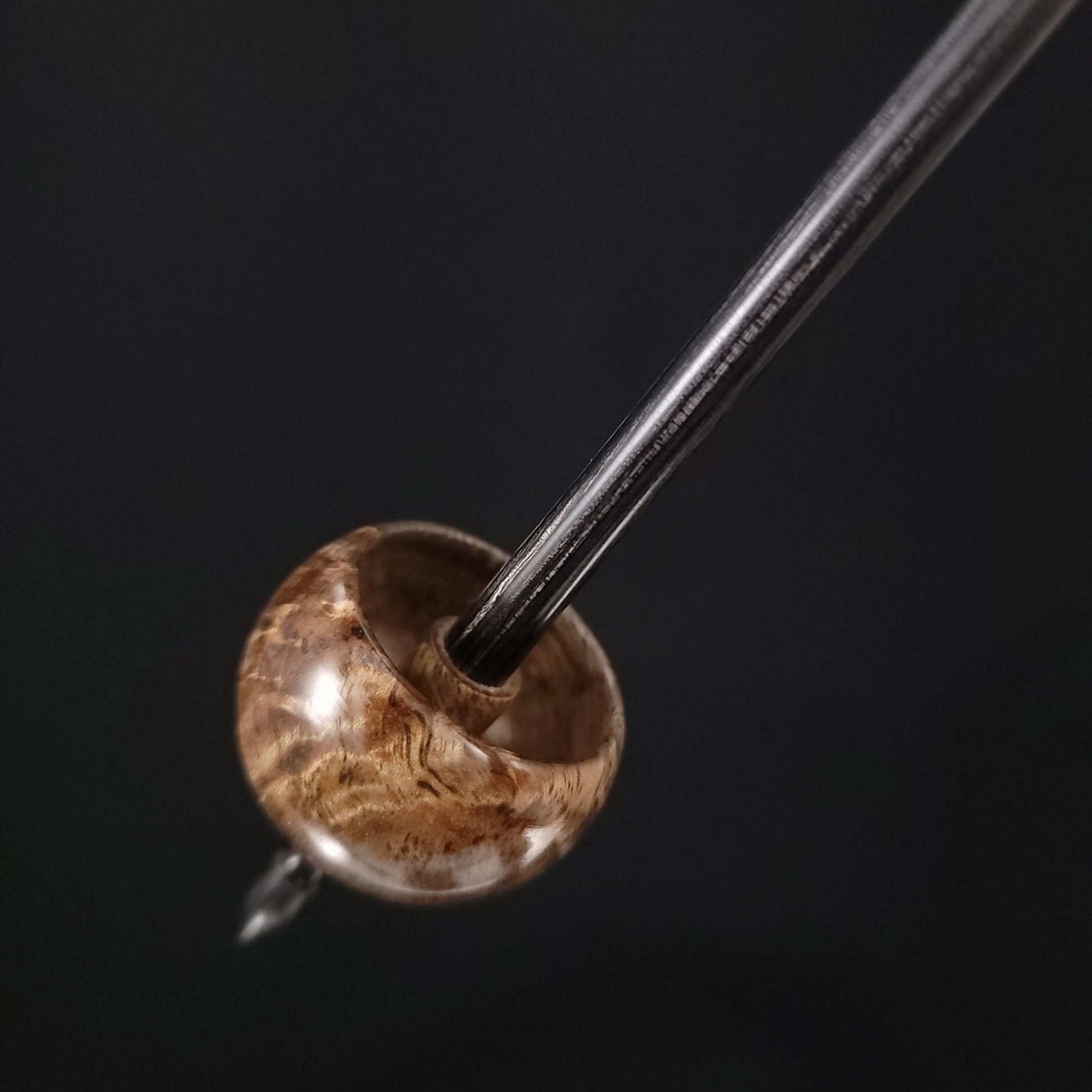 Full size ninja spindle turned in stabilized curly black mango and set on an onyx Dymalux shaft. This spindle measures 11" inches long and weighs 24 grams.
