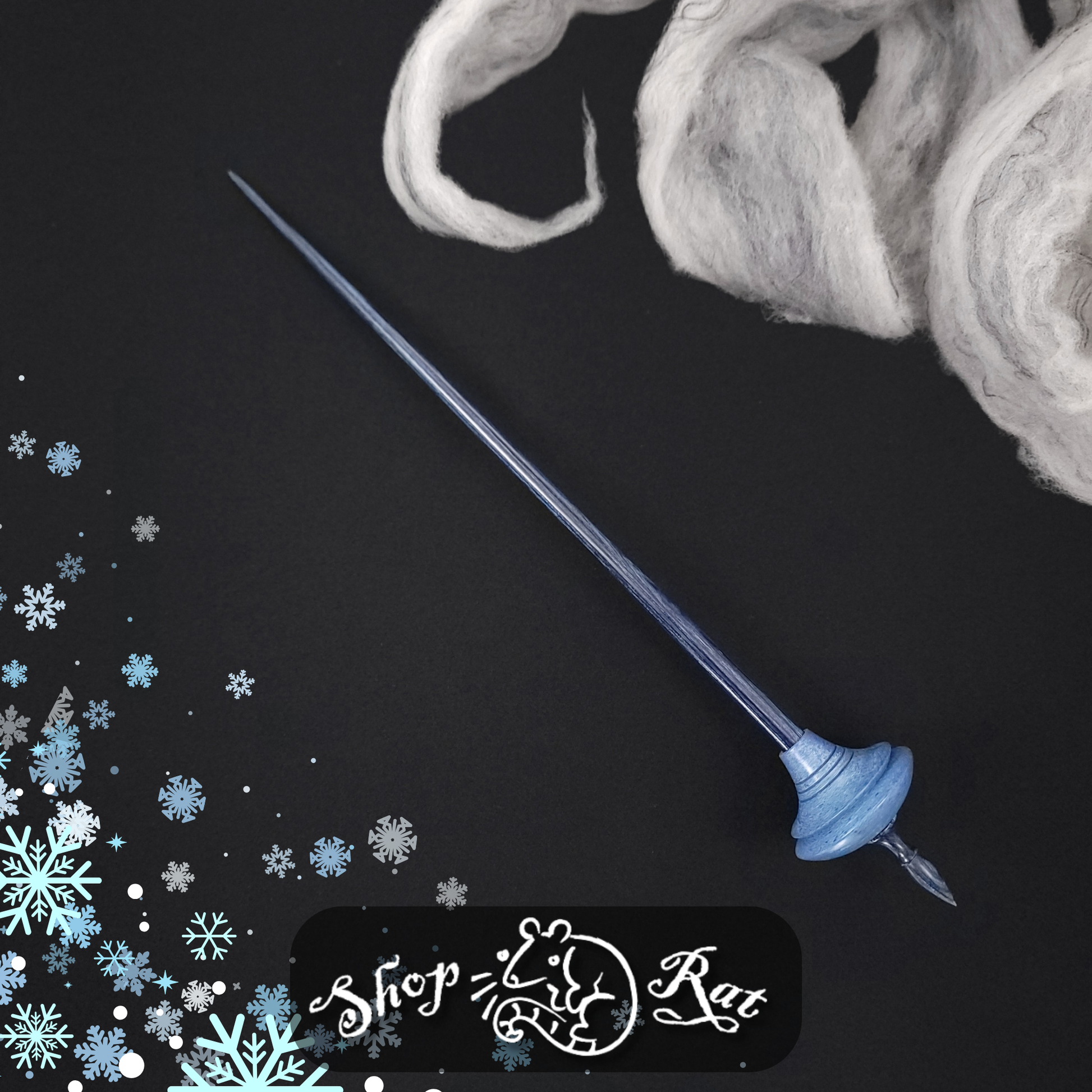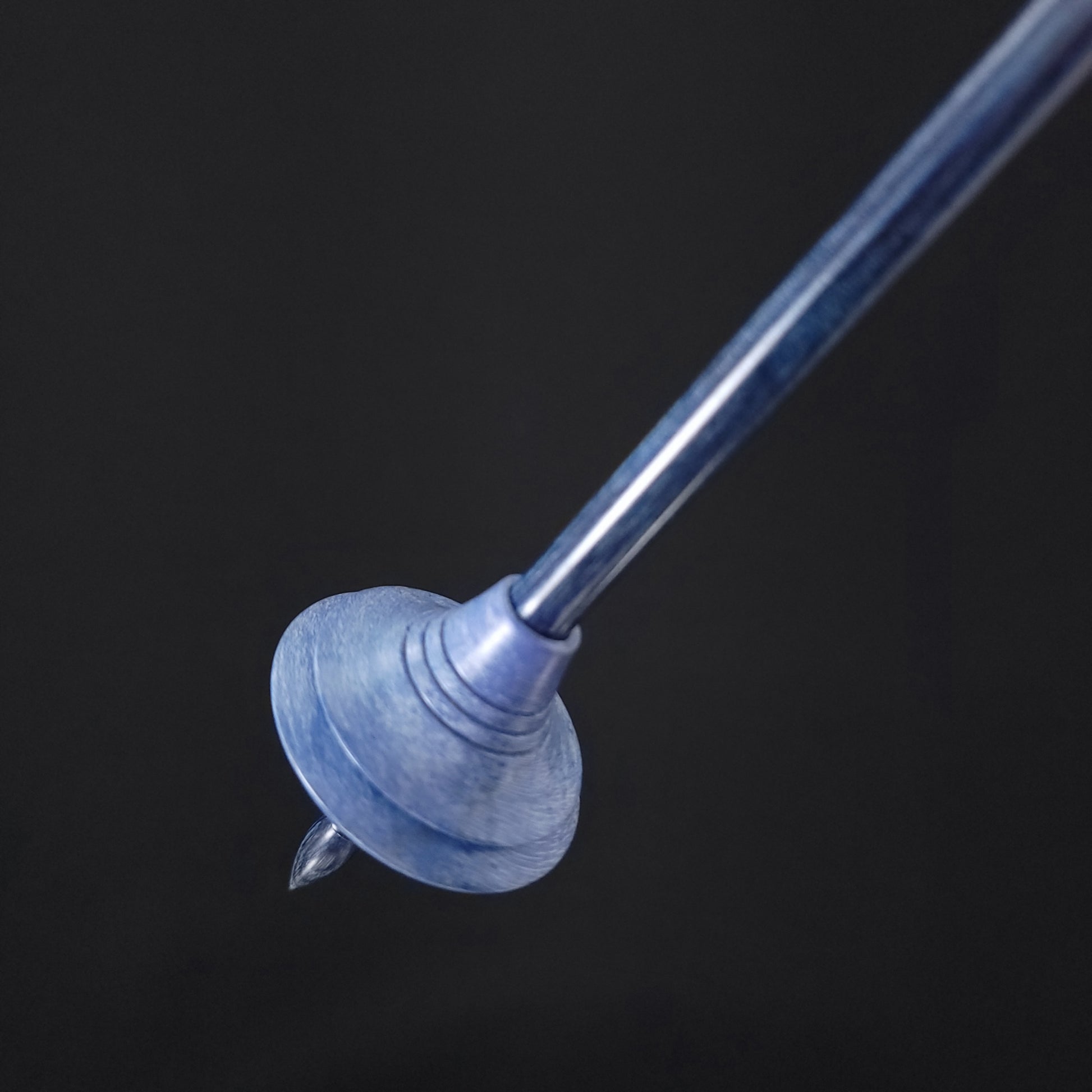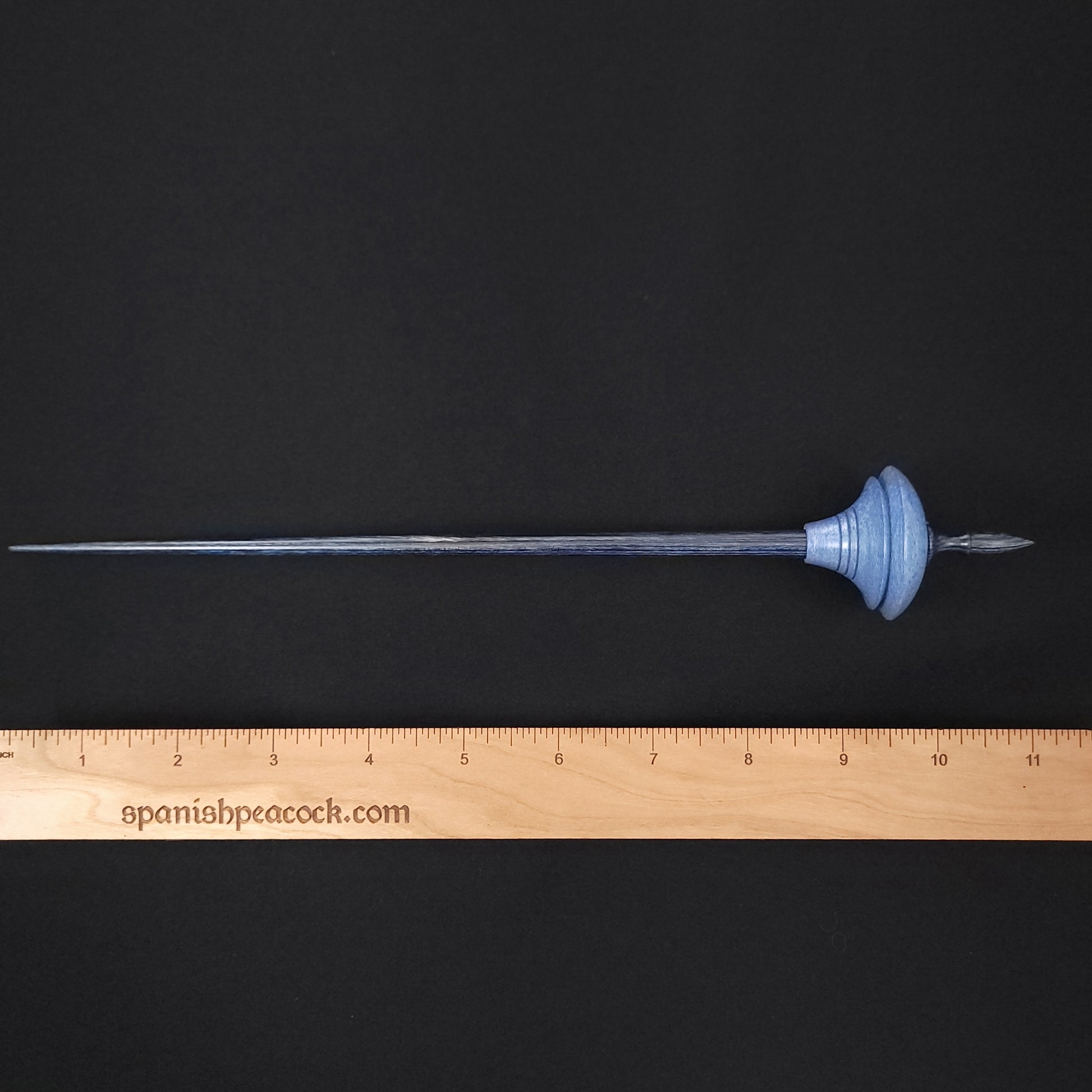Full size bead spindle turned by the Shop Rat in dyed & stabilized sycamore and set on a blue Dymalux shaft turned by Mike. This spindle measures 11" inches long and weighs 23 grams.
