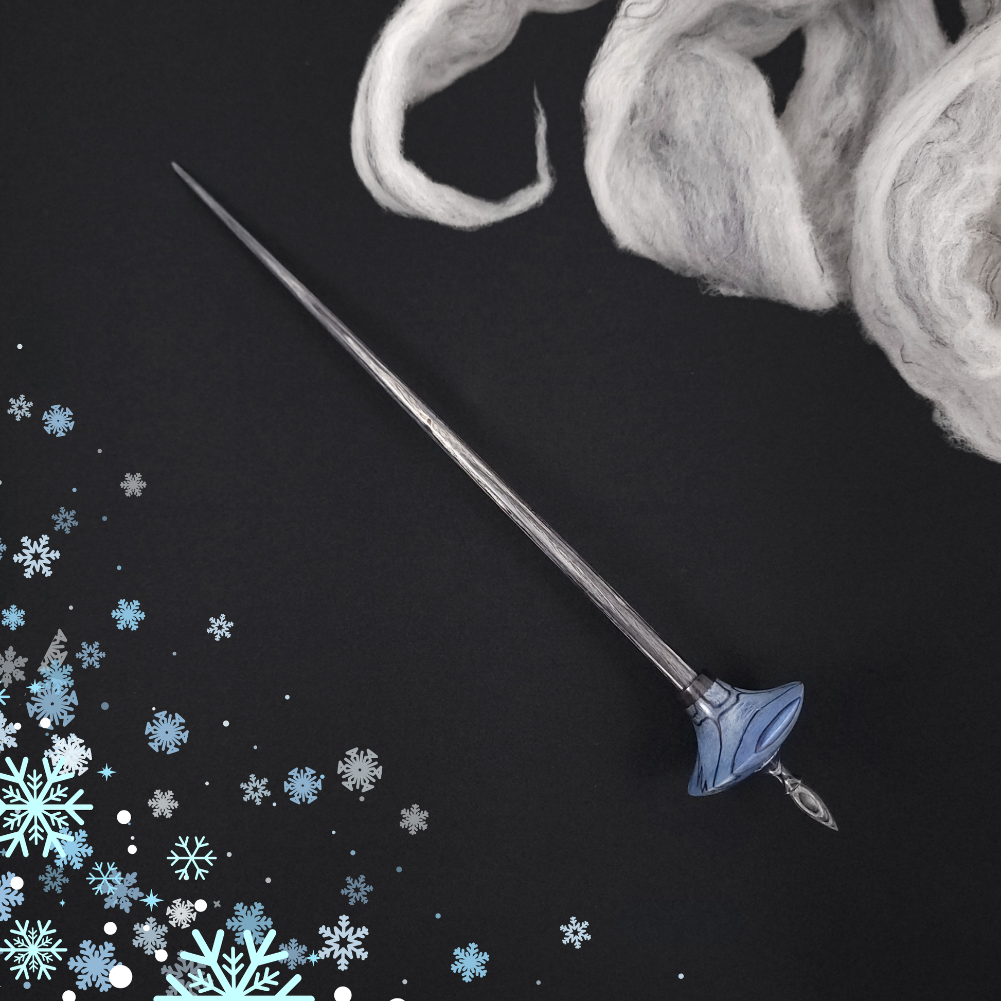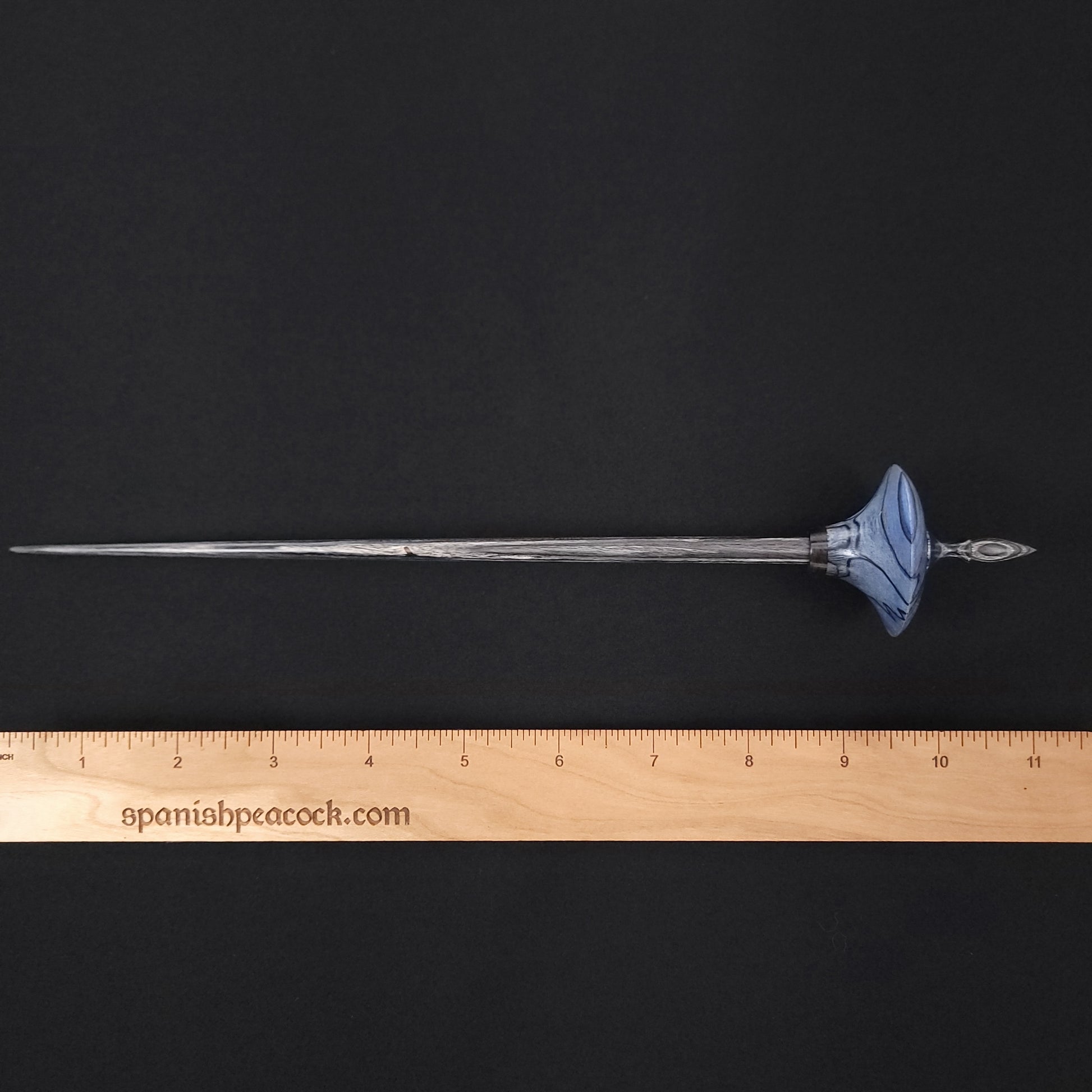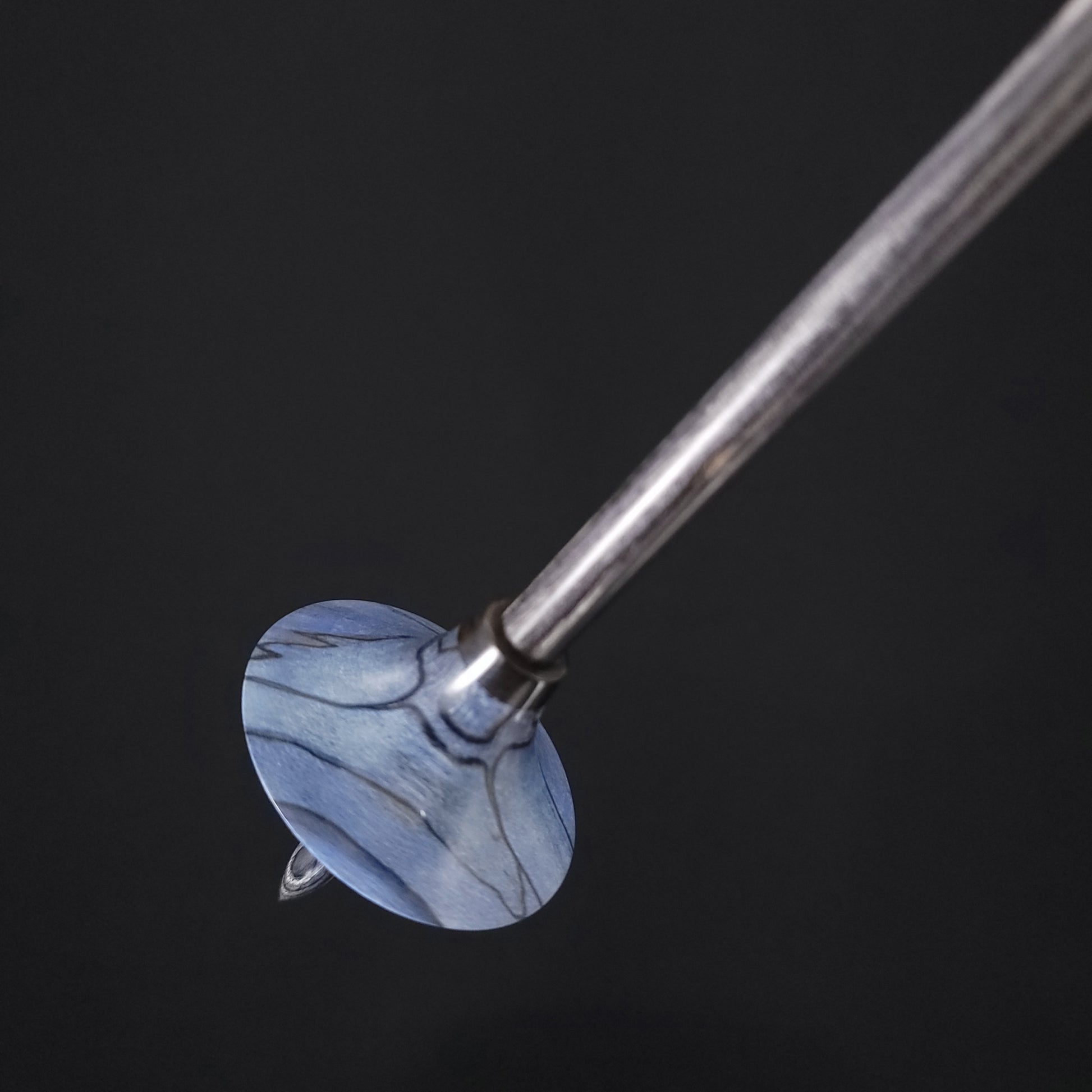 Full size bead spindle turned in dyed & stabilized spalted holly with a Gabon ebony collar and set on an onyx Dymalux shaft. This spindle measures 11" inches long and weighs 24 grams.