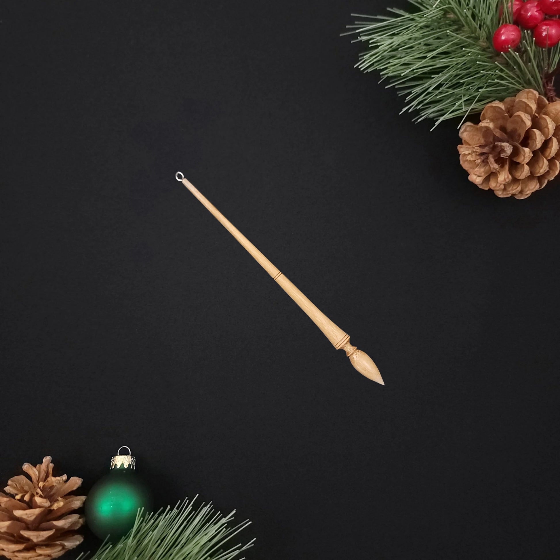 Adorable black locust holiday ornament shaped like a Russian lace spindle. Each ornament measures around 6.5 inches. A perfect addition to your fiber-themed Christmas tree, or a great gift for a fibery friend.
