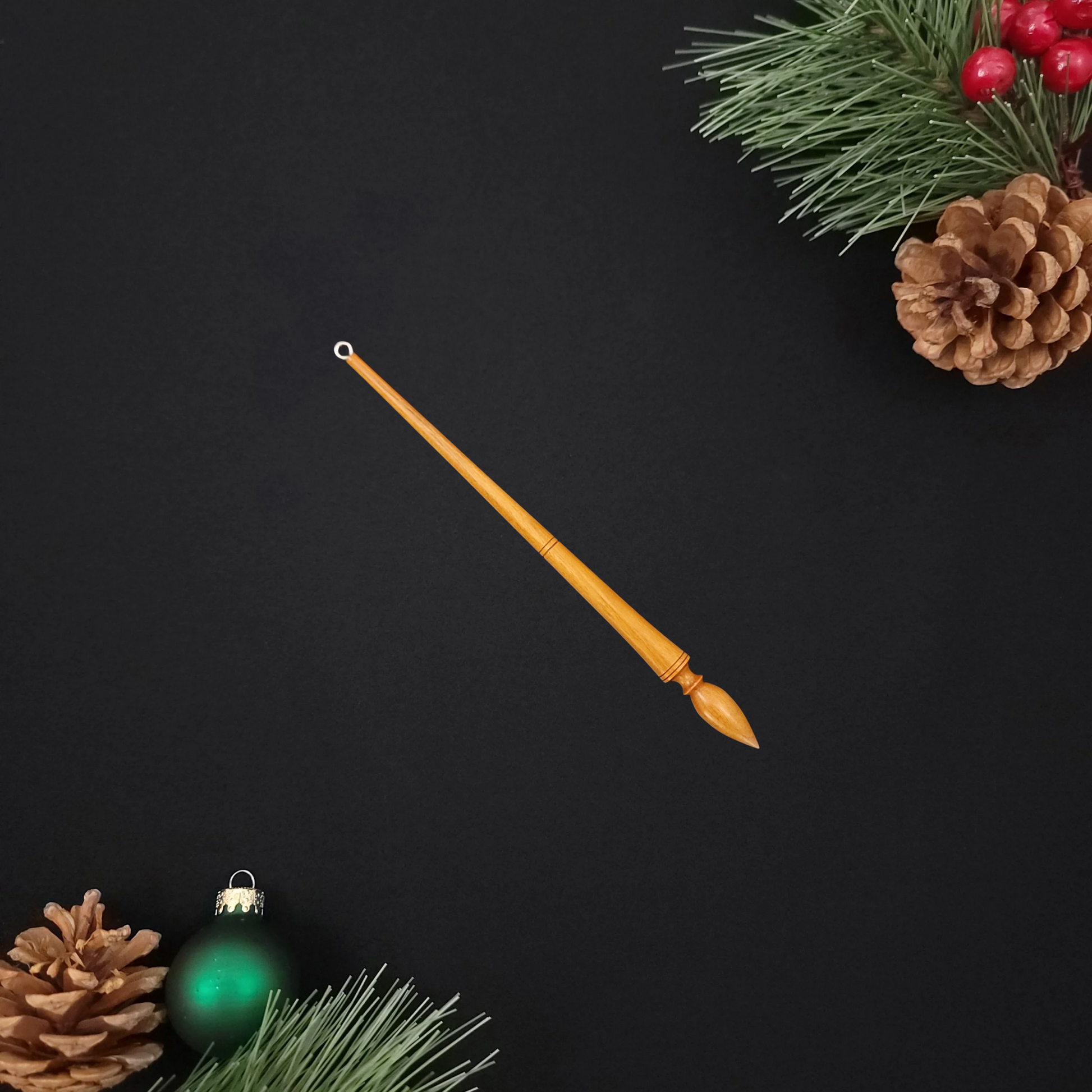 Adorable chakte viga holiday ornament shaped like a Russian lace spindle. Each ornament measures around 6.5 inches. A perfect addition to your fiber-themed Christmas tree, or a great gift for a fibery friend.