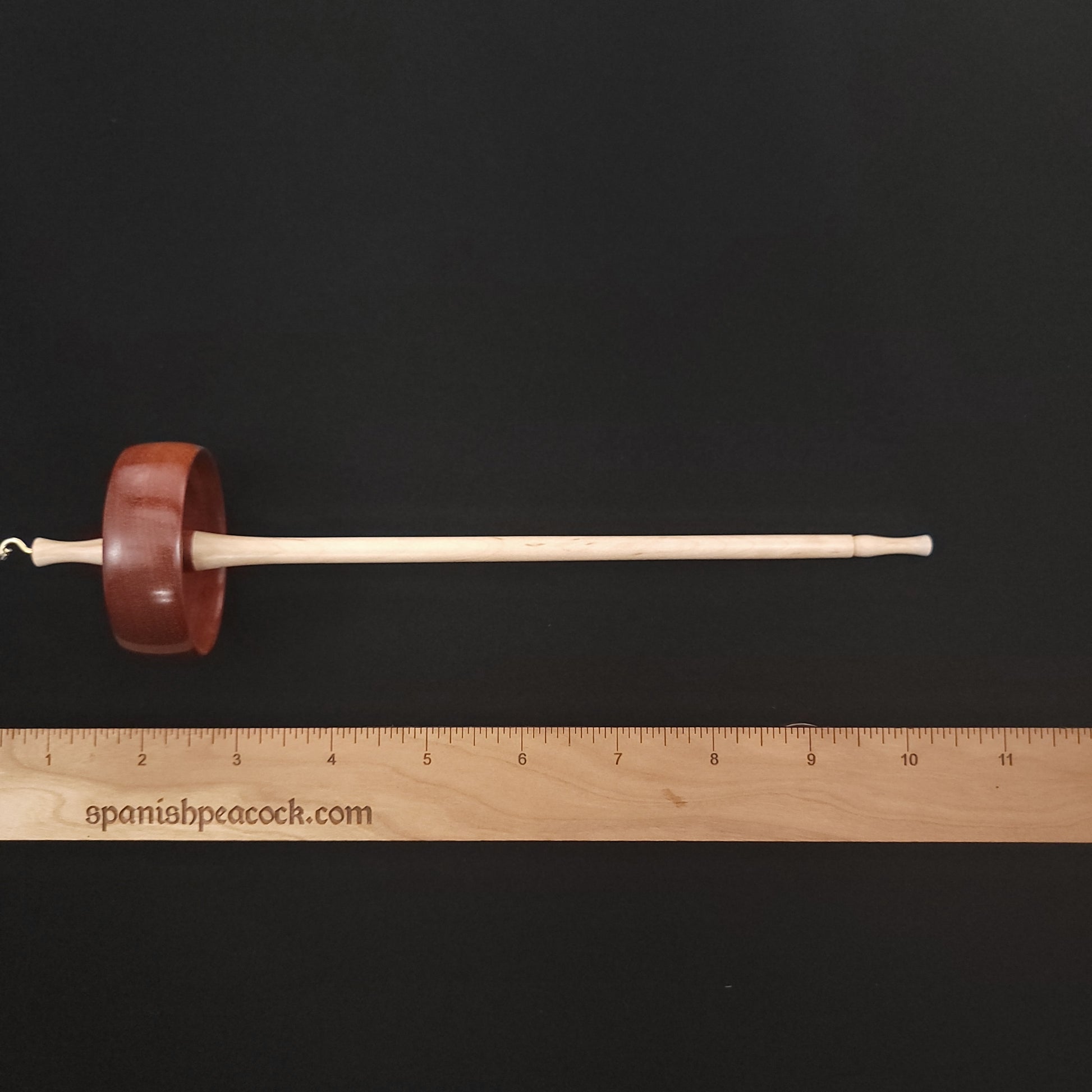 Small top whorl spindle turned in bloodwood and set on a hard maple shaft, engraved with one of our unique designs, and set on a walnut shaft. This spindle measures 9.5" inches long and weighs 20 grams.