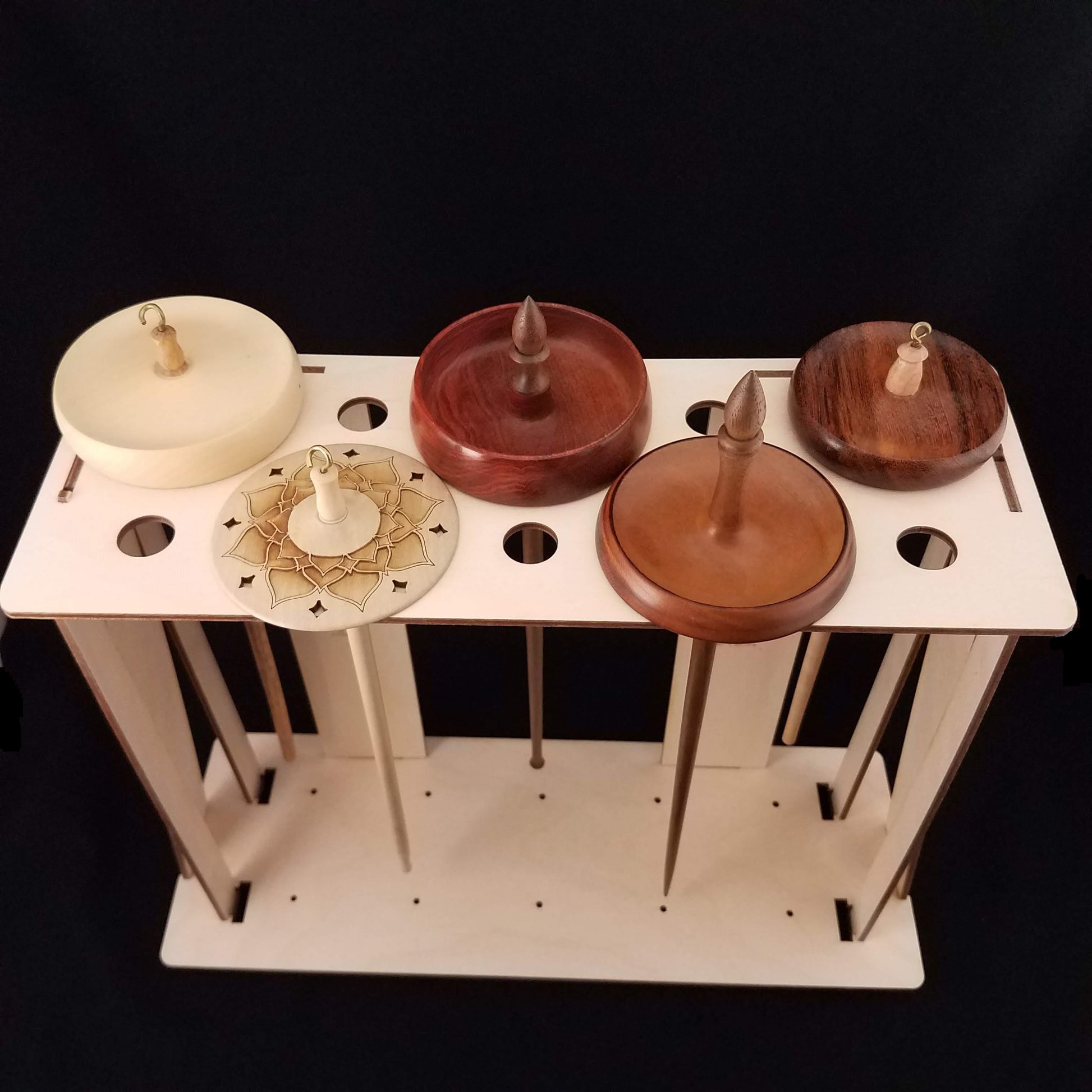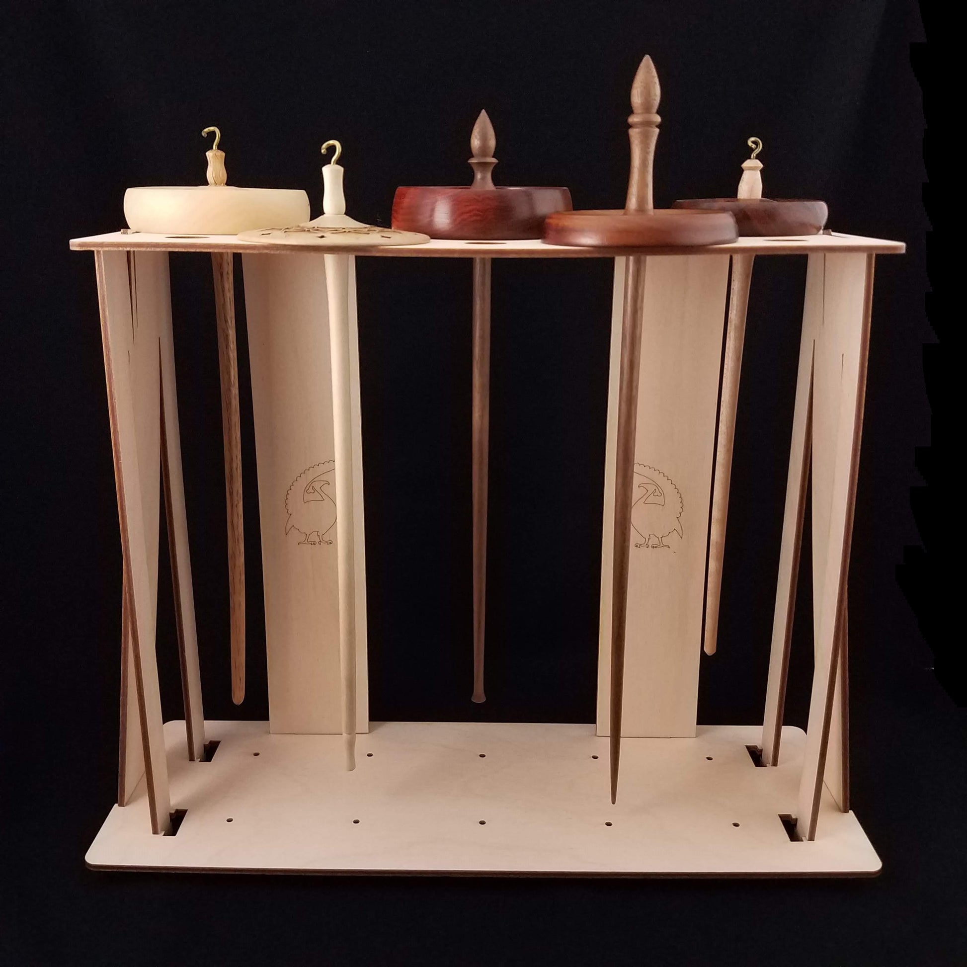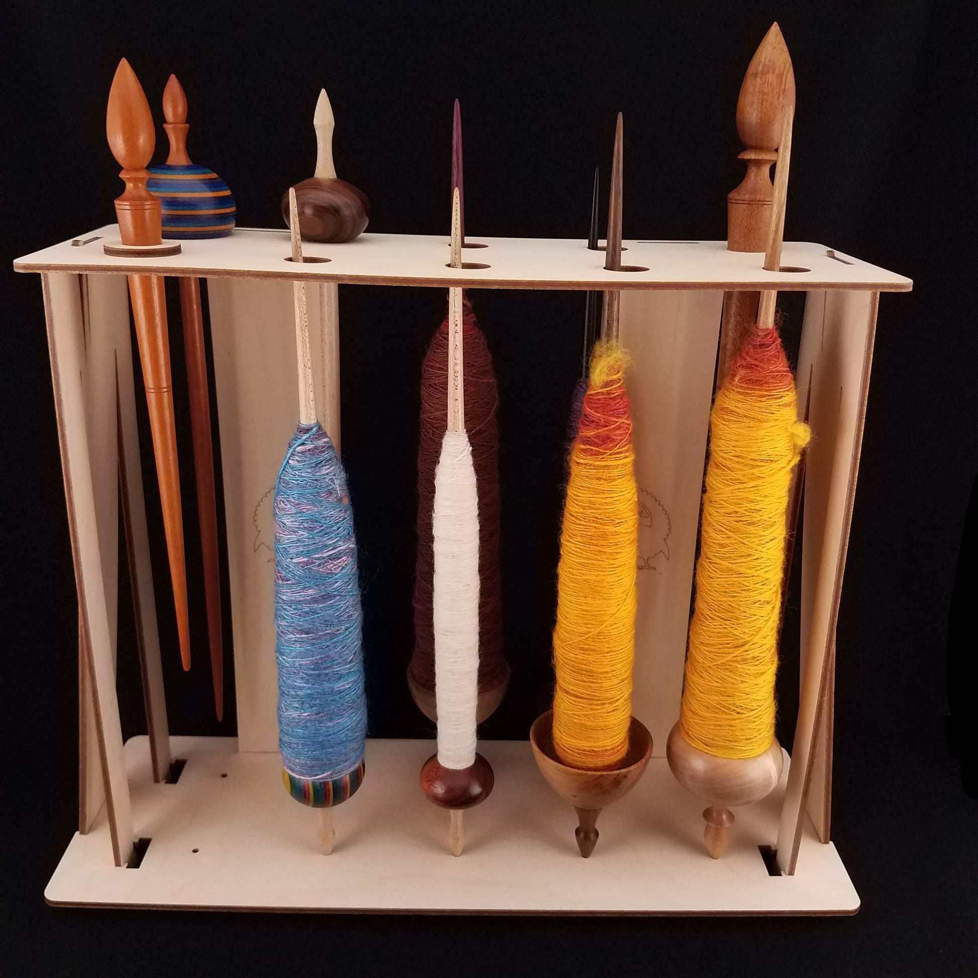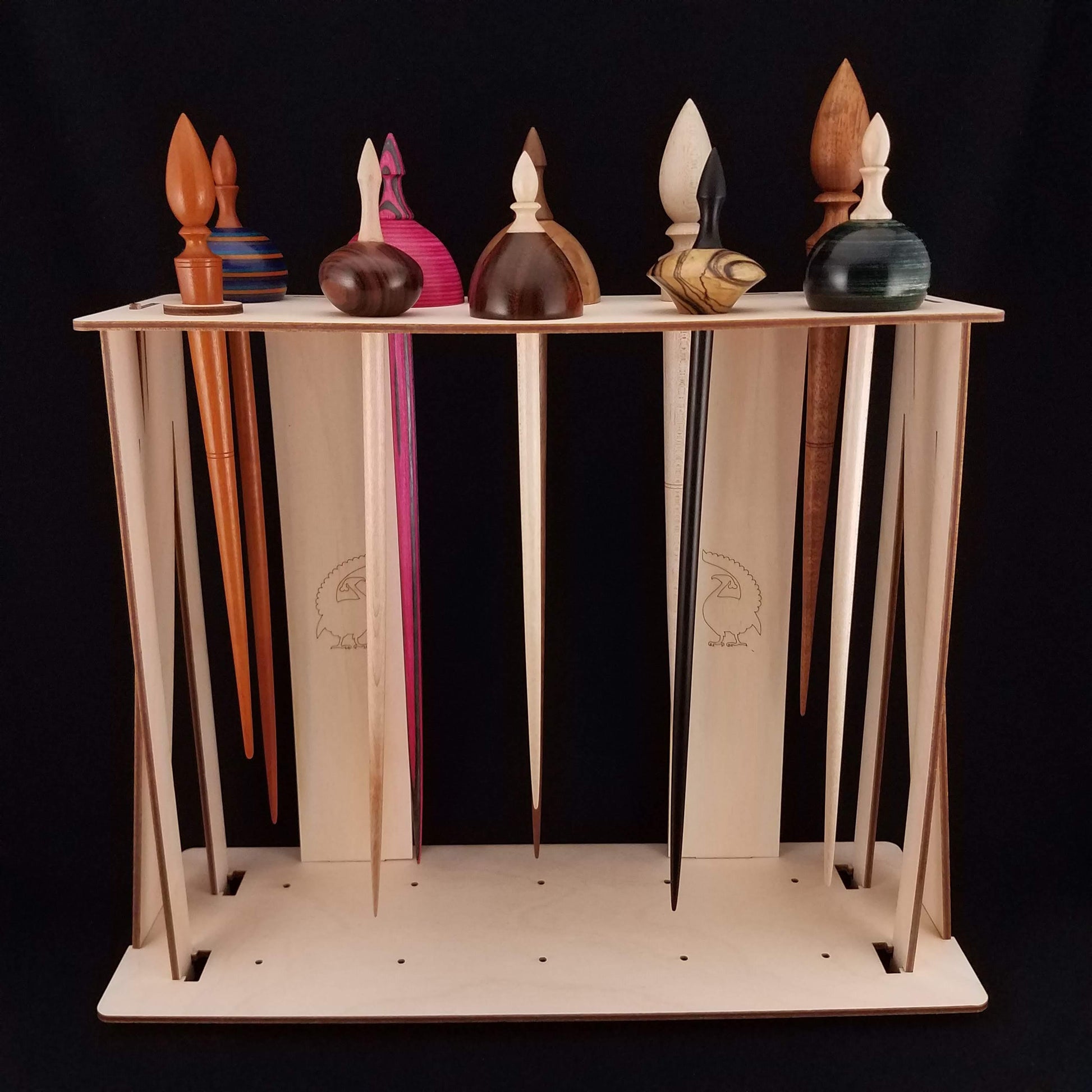 The spindle storage stand measures 10.5" tall by 13" wide by 4.5" deep. The slim design allows it to quietly protect your spindles on a narrow ledge or bookshelf. The spindle storage stand holds up to ten small-whorled spindles (like beads, Tibetans, etc.), or five large-whorled spindles (like a pu-yok or full-sized top whorl). It can accommodate shaft lengths of up to 9.5" from whorl to tip.