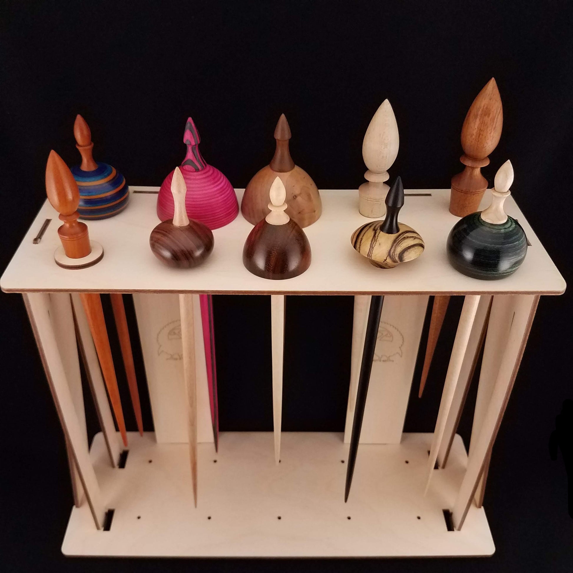 Introducing the Spanish Peacock DOUBLEWIDE spindle storage stand! We have always believed the best way to store a spindle is perfectly vertical, since even slight pressure on the shaft can introduce wobble. (The horror!)