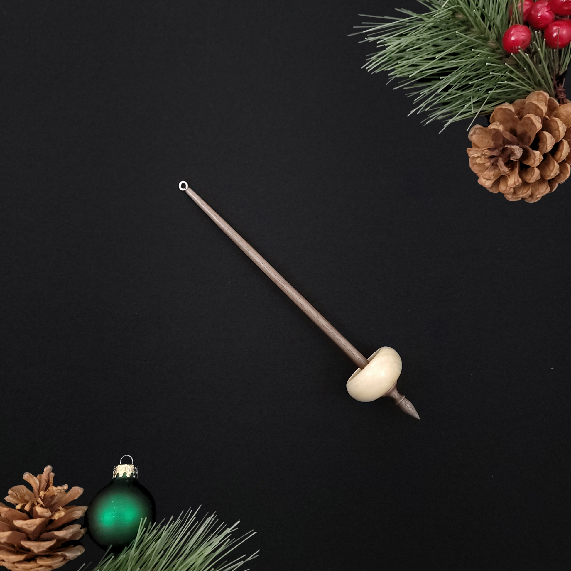 Adorable holly and walnut holiday ornament shaped like a Bob supported spindle. Each ornament measures around 6.5 inches. A perfect addition to your fiber-themed Christmas tree, or a great gift for a fibery friend.