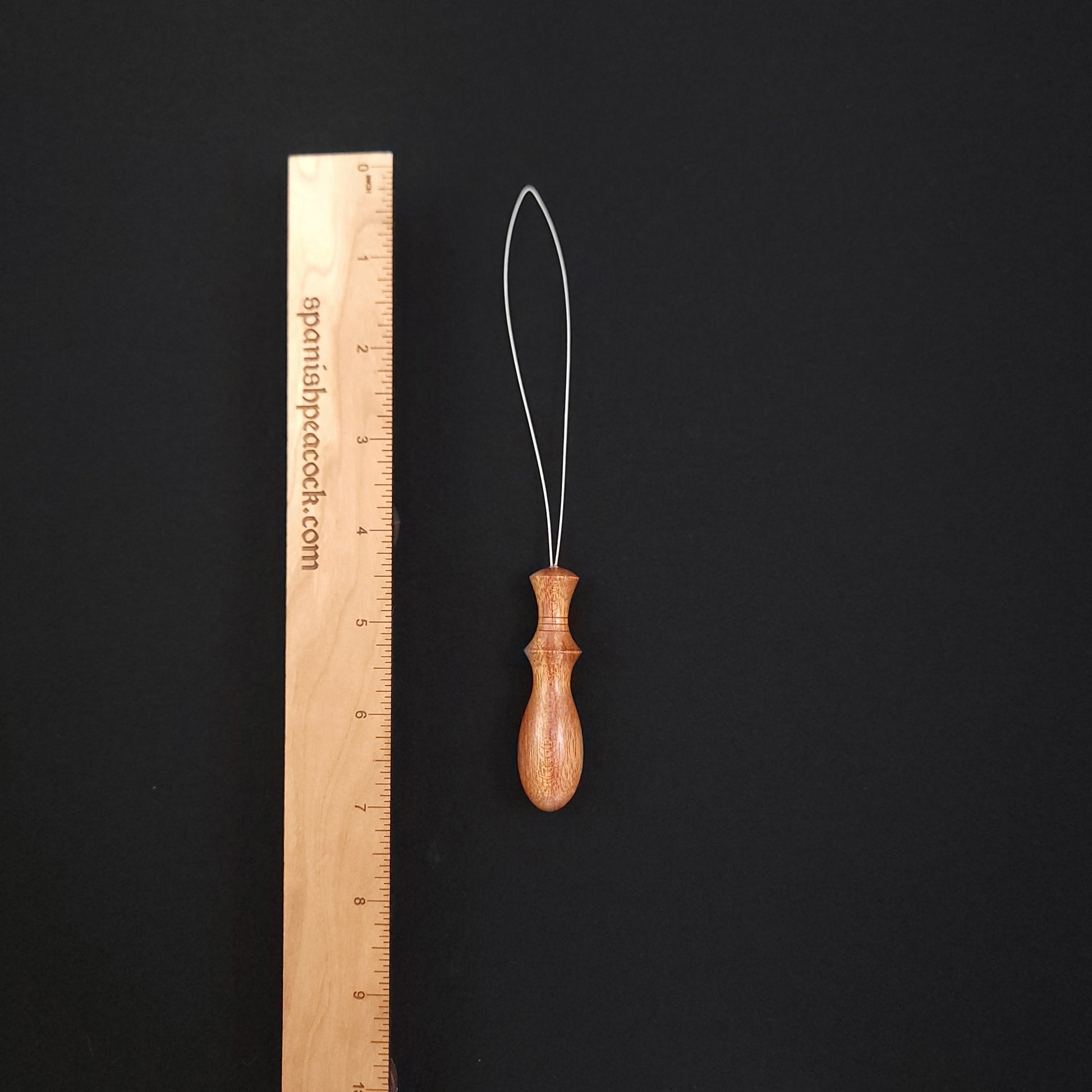 Orifice hook with a 2.75" long bloodwood handle. The flexible and bendable coated wire loop has been tested for fit in a variety of flyers, even on antique wheels. This threader can also be used for other purposes such as warping rigid heddles and dressing dizzes.