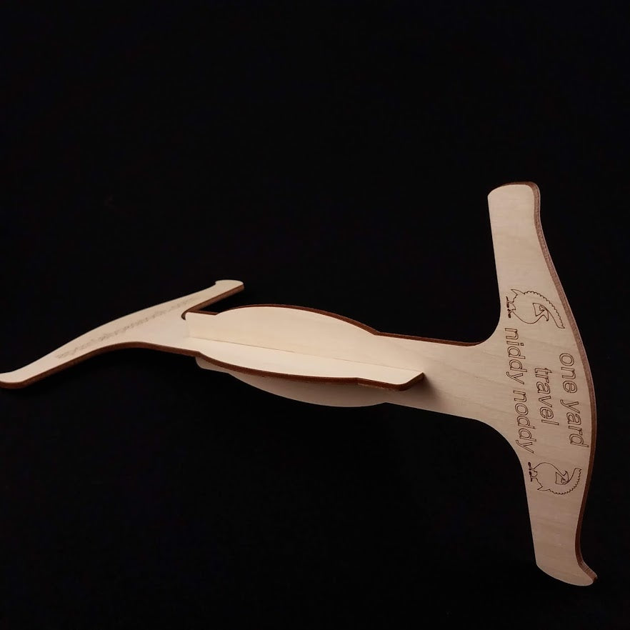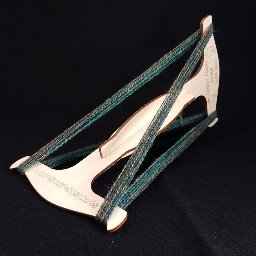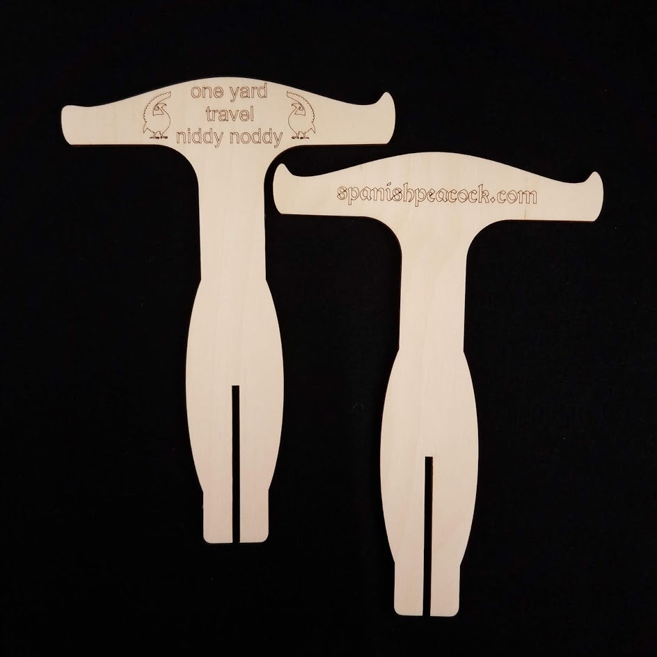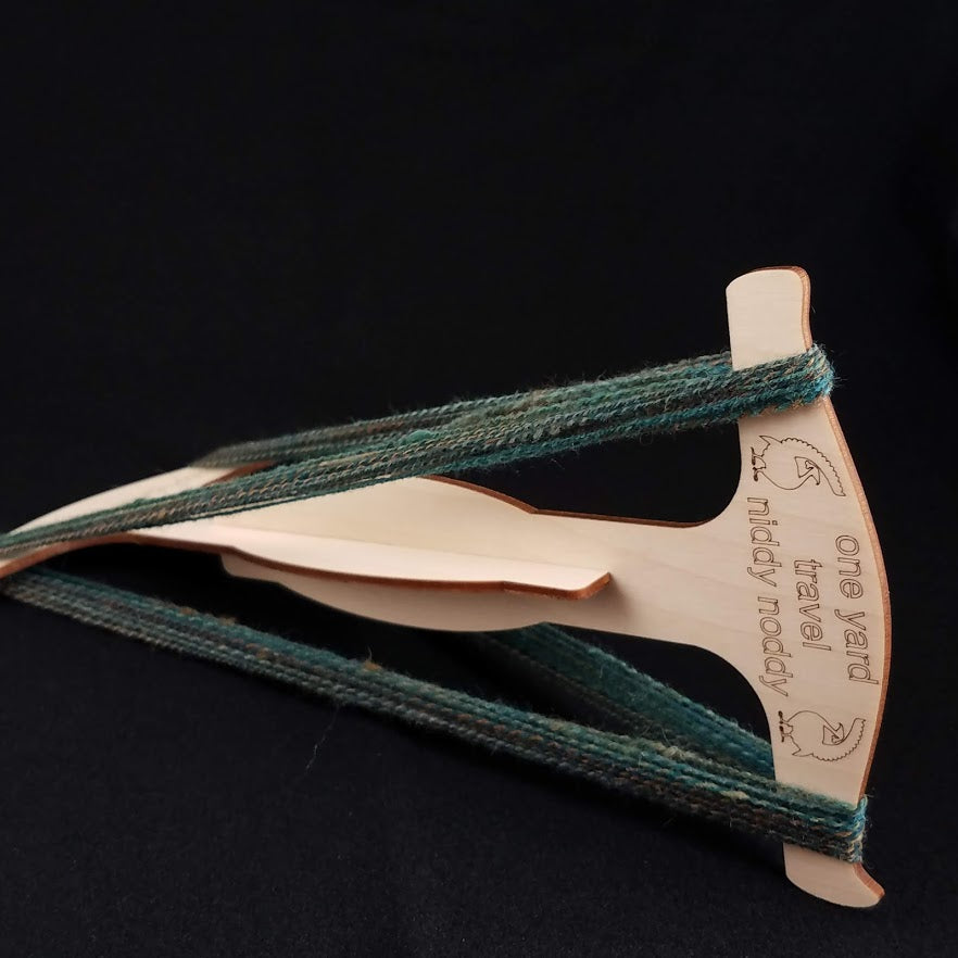 One yard travel niddy noddy - perfect for spinners on the go! Made of birch plywood for extra strength and durability. The pieces fit snugly to help the niddy noddy stay together during the first few passes of yarn. Use gentle pressure, because even plywood can break if too much force is applied. One end of one arm is lower than the other three ends, to allow you to more easily slip your yarn off the niddy noddy once skeined.