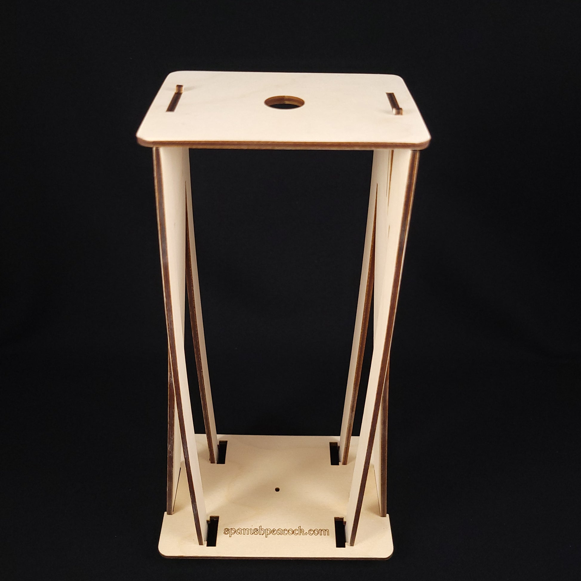 The Spanish Peacock spindle storage stand comes unfinished so you can stain, paint or otherwise embellish it to meet your needs. However, PLEASE wait until after assembly to do so, otherwise the wood may swell to the point where the pieces no longer fit together.