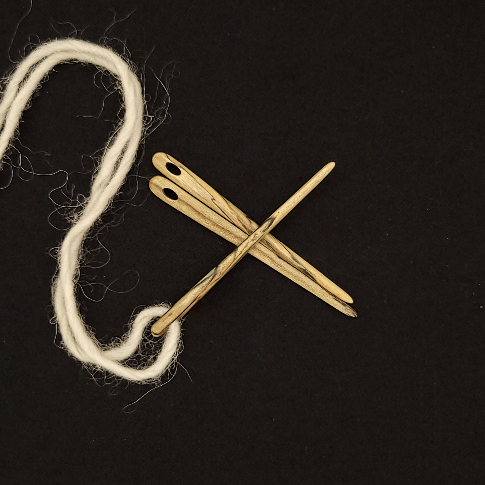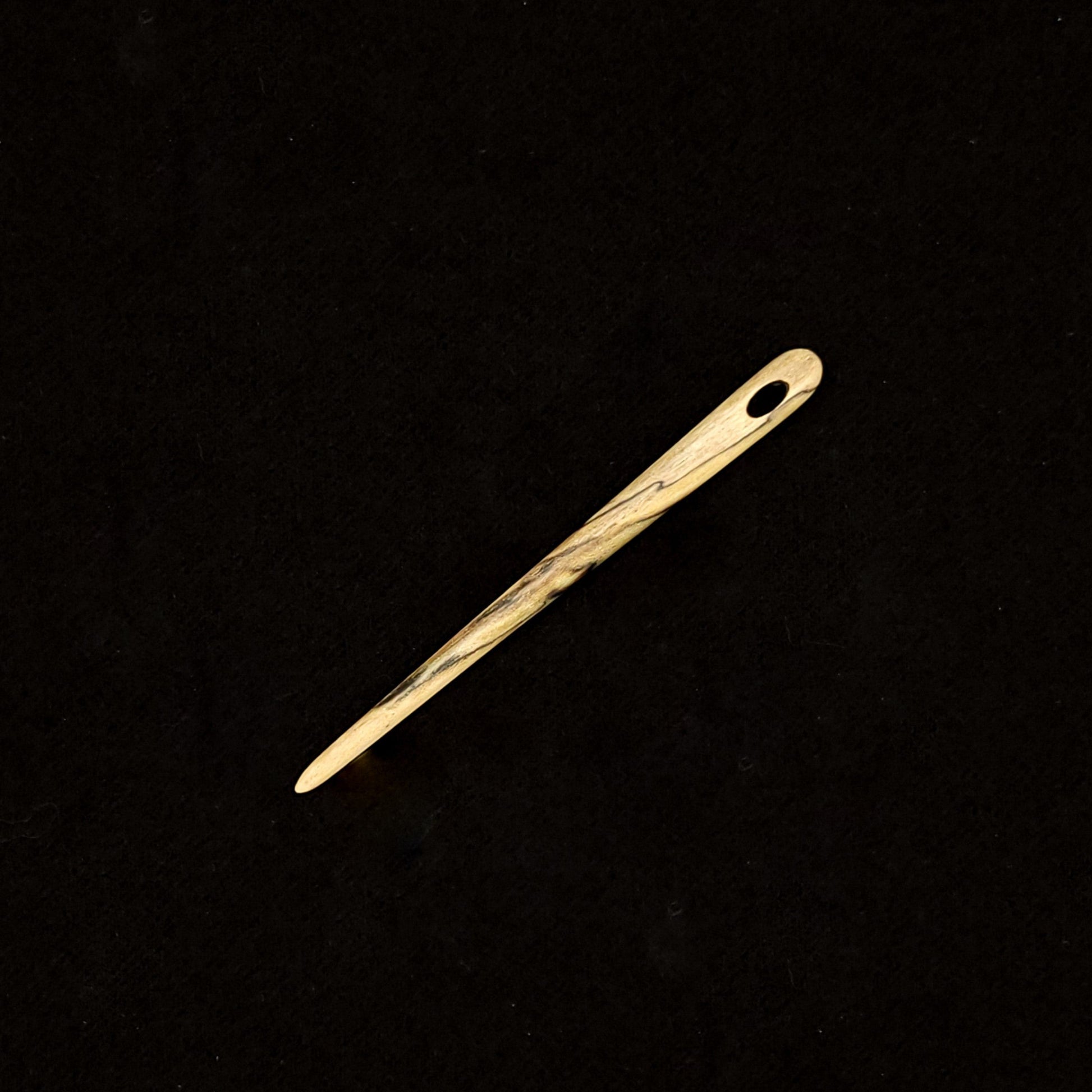 3.5" long straight naal (needle) made from stabilized spalted holly. Used for naalbinding, which is also known as single-needle netting. These naals feature an oval hole to accommodate thicker yarns, and are hand sanded extra smooth.