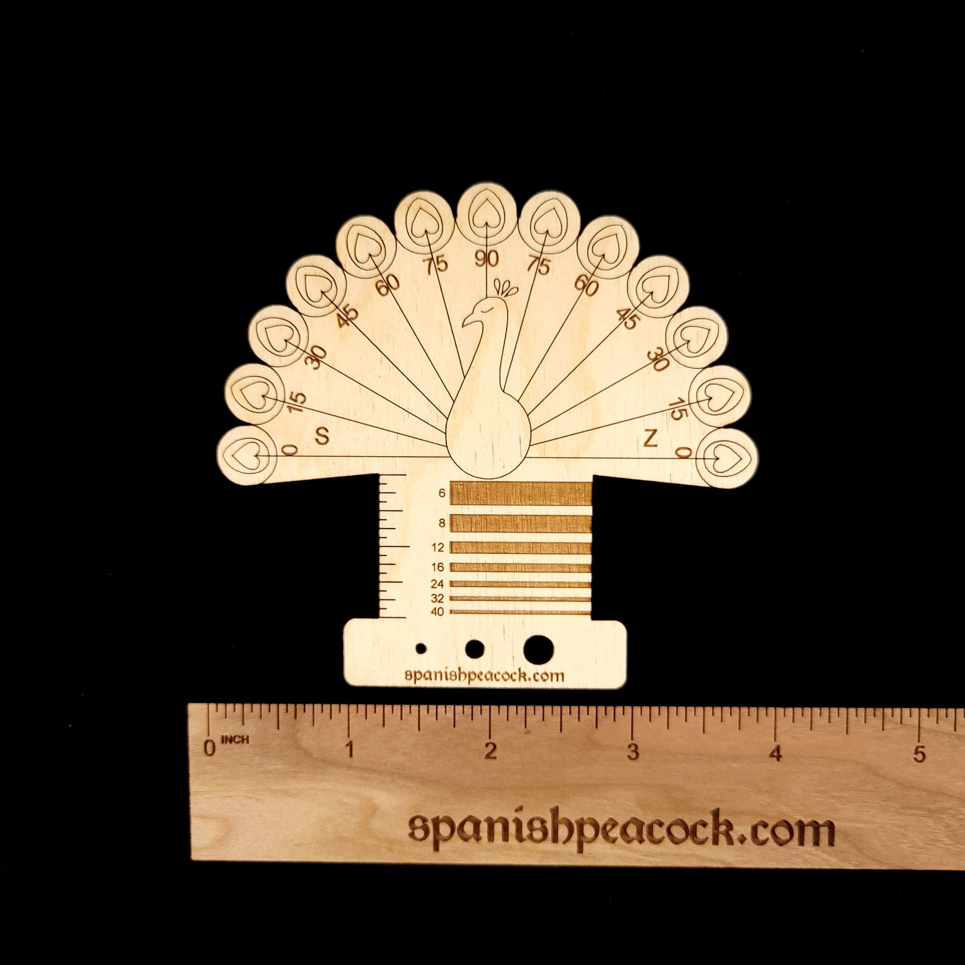 This handy tool is laser engraved and cut from sturdy 1/8" birch plywood, and measures 3.75" wide by 3.5" tall—a convenient size to travel in your spinning project bag.