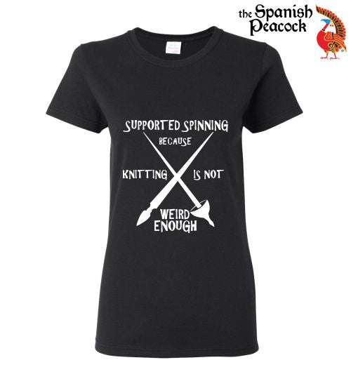 Love to spin supported? Proclaim your spinning pride with this eye-catching t-shirt! Supported spinning - Because Knitting Is Not Weird Enough! The example shows the design in white on a black shirt.