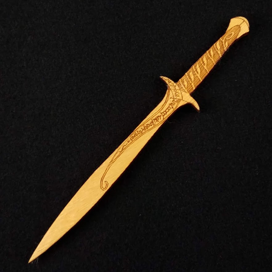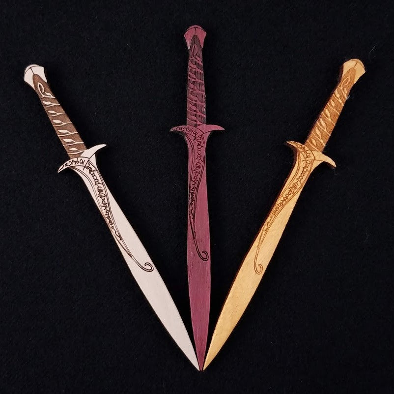 Now available by popular demand! The Lord of the Rings Sting sword is now your favorite shawl pin! The sword measures 4.5" long and is made from yellowheart, holly, or purpleheart wood.