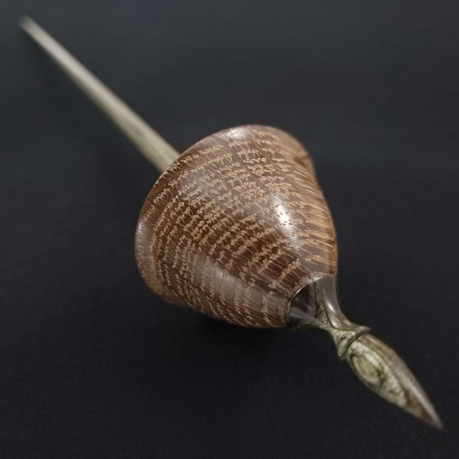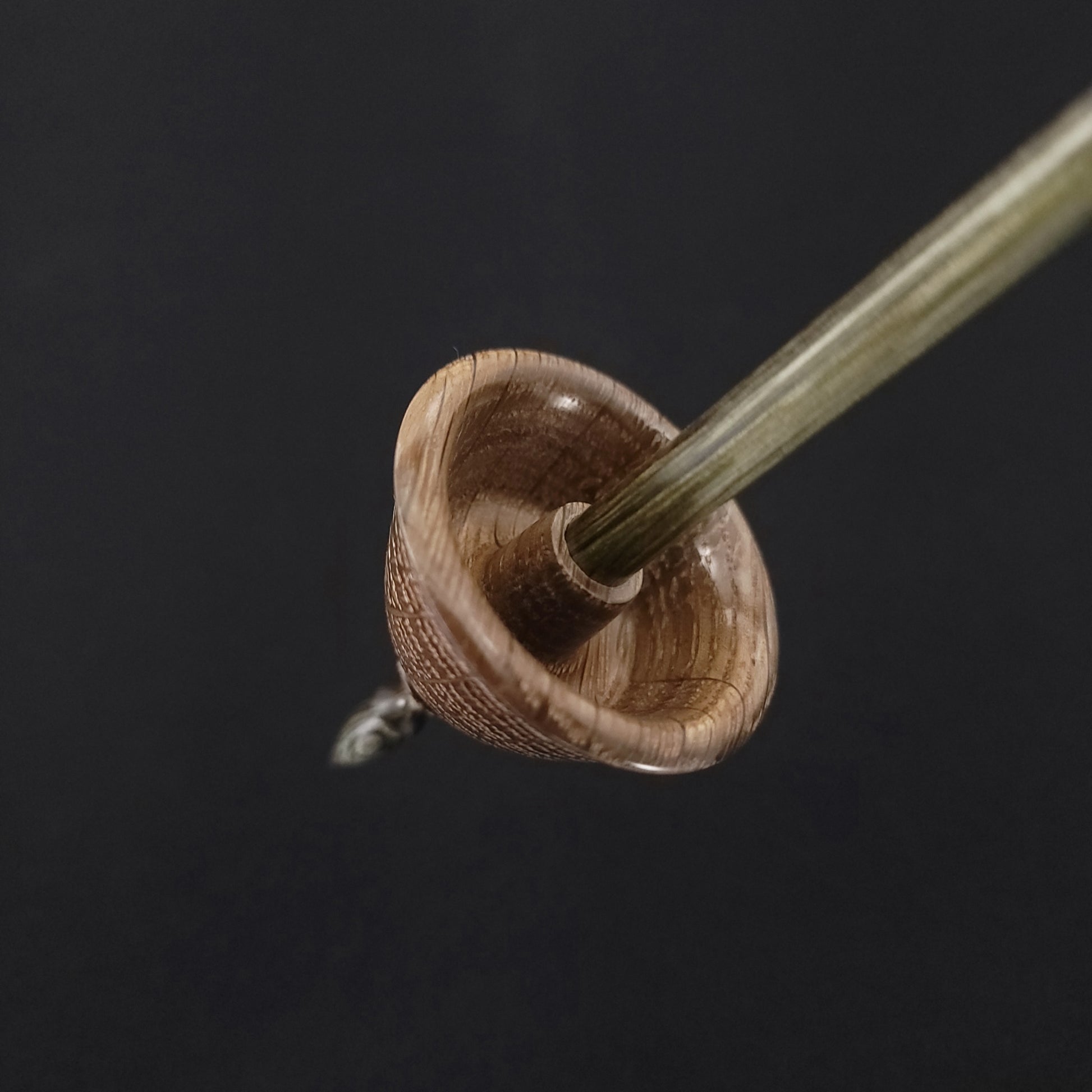 Full size Tibetan spindle turned in fumed white oak and set on an olive-colored Dymalux shaft. This spindle measures 12" inches long and weighs 22 grams.