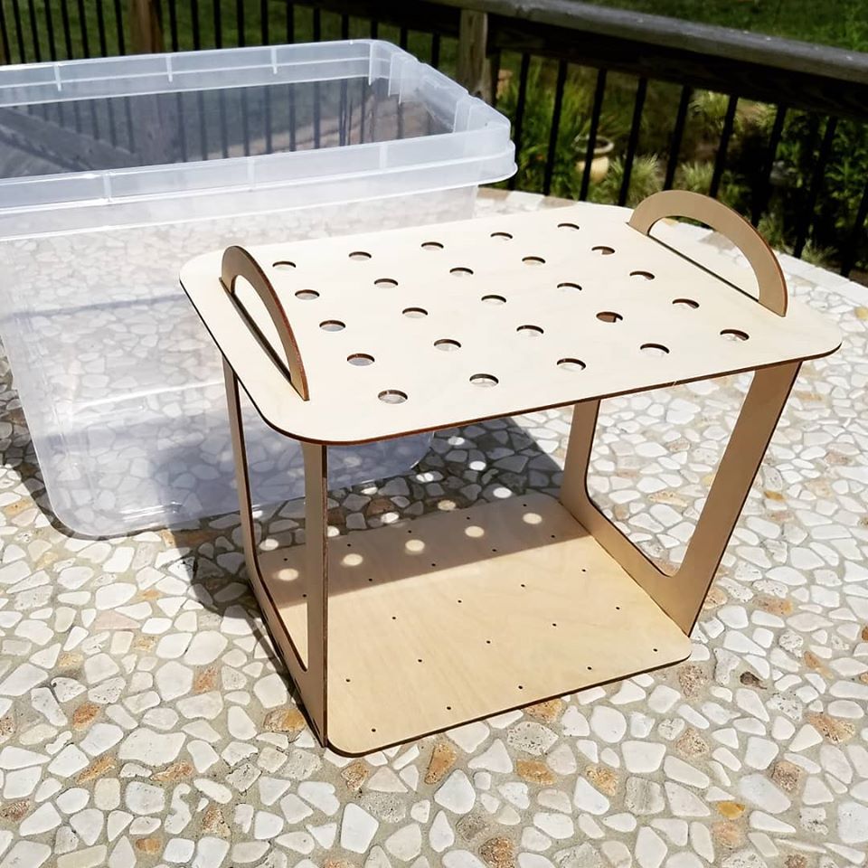 Protect your spindles in style with this stand specifically designed for the Hefty Hi-Rise 32 qt Slim Clear Plastic Storage Bin. This allows your spindles to be stored perfectly upright and protected from the elements.