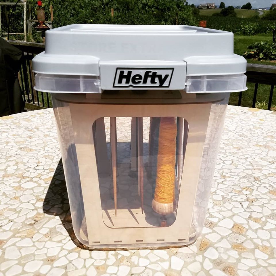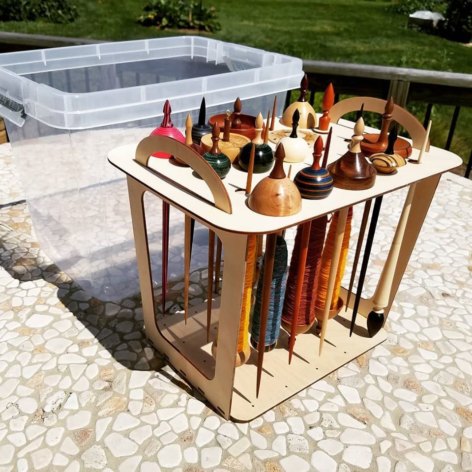 About the storage stand: Cut from high quality 1/8" Baltic birch ply, this stand can hold up to 25 spindles, depending on the size of the whorl. Holes on the bottom of the stand allows thicker spindles, or spindles with cops, to be stored as well. Handles on the side allows the entire unit to be lifted out of the tote for easy access. If you need to store thinner spindles, like pocket Russians, you may need adapters which you can find here.